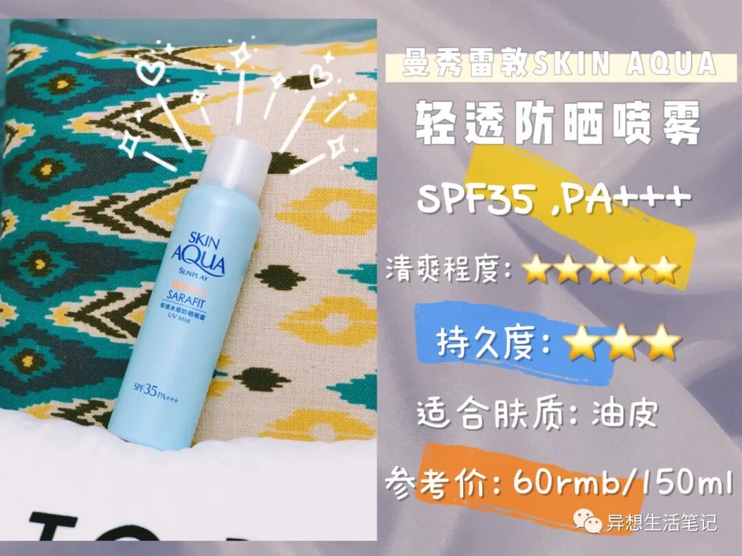 下面再给大家安利两款防晒喷雾。其实我本身用防晒喷雾的频率不高,一般我都是带出门补妆时使用,选购重点在于