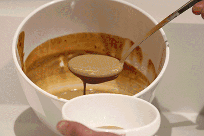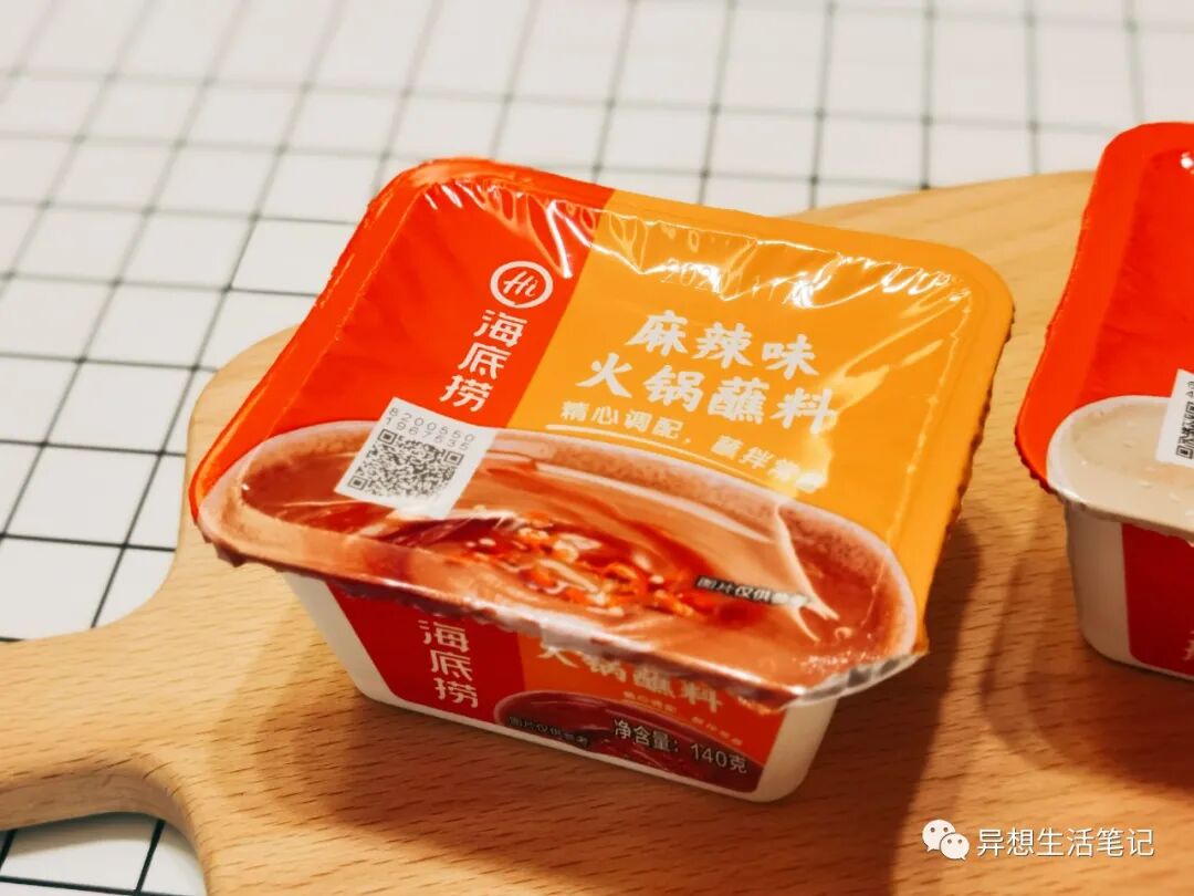 接下来就是一包搞定的混合型蘸酱出场了!每一款混合酱料突出的口感也不太一样,先来说说不辣,鲜香口的。很多海底捞的真爱粉都推荐它家这款蘸料,加了花生酱和芝麻酱,麻酱的味道比较突出。酱料是顺滑细腻的,油和酱融合得挺好,还挺适合用来涮丸子和青菜类的。一家三口吃一次开一小盒就好。海底捞的包装还蛮贴心,一次没吃完可以盖上透明盖子放冰箱保存。德庄醇香芝麻火锅蘸料