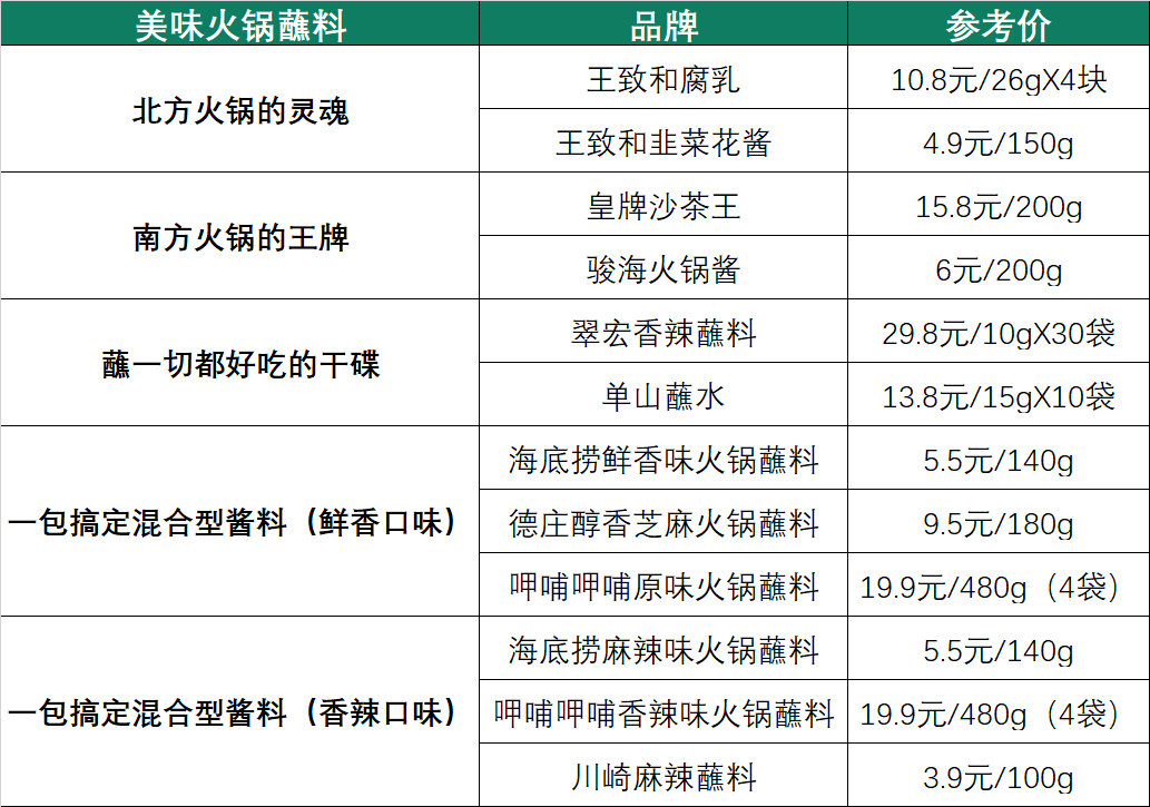 川崎的火锅底料也一直都蛮受欢迎的,很多人会用它家的料来煮汤面啊麻辣烫之类的,之前看《幸福三重奏》顿顿吃火锅的奚梦瑶夫妇可是囤了不少。它家的麻辣蘸料也是很多火锅党推荐的,很便宜,一次用完一小罐也不怕浪费。说是麻辣,但我觉得更偏香辣~对比起其他几款它会有点偏咸口,一次不要放多,吃的时候可以往里加一点汤底中和一下~不得不说,这些现成品的蘸料真的是造福懒人啊~在家约火锅也不用卡在准备各种调料这一步而没下文了。现在很多火锅蘸料的包装也做得越来越人性化了~最后来个小总结,文中分享的蘸料在电商平台搜品名都能找到,以下价格也仅供参考哦。