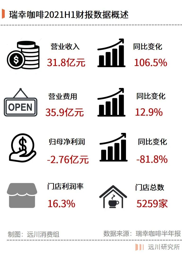 从数据上看,2021年上半年瑞幸咖啡营收31.83亿人民币,较去年同期的15.45亿元同比增长106%,营收的大幅增长主要归功于门店层面的销售额同比增长82.7%。