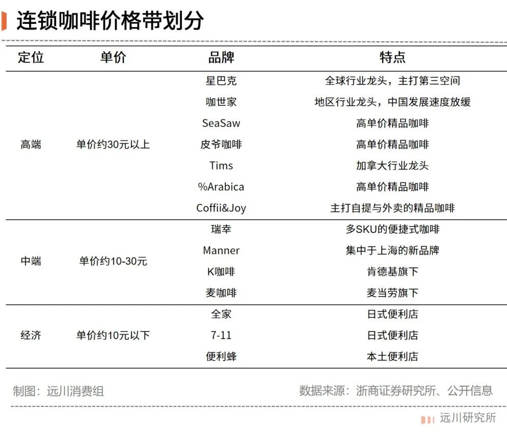 高端连锁咖啡以星巴克、咖世家为首,基础款咖啡30元起步,部分产品可以高达60元,这些咖啡店沿用海外运营经验,产品以上等咖啡豆制成的标品咖啡为主,通常配备较大的门店以附加“第三空间”属性,使得消费者愿意为更高高品质及商务社交等需求支付一定溢价。