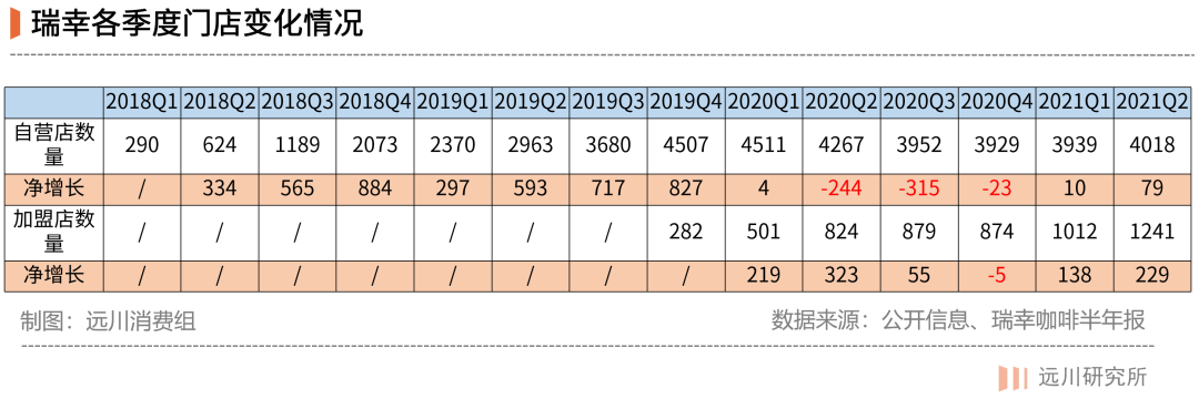 在瑞幸的5259家店中,4018家为自营店,1241家为加盟店。自营店较上年同期的减少了5.8%,加盟店则较上年同期增加了50.6%。瑞幸持续收缩自营店,并用加盟模式来控制试错成本。