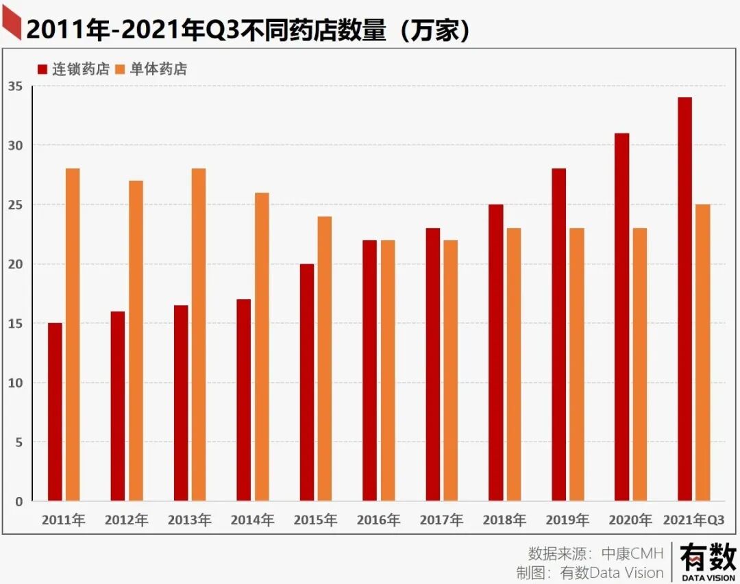 理论上来说,买药只有三种“正规渠道”:1.以医院为主的官方医疗机构;2.阿里健康等线上药房;3.老百姓和益丰这类药房。后两者可以统称为院外药房。连锁药房的第一次高速发展,就源于新医改前屡禁不止的“以药养医”。在三明模式被推广前,医院有动力不断抬高药价赚取利润,甚至财政部都觉得药价太高,医院药品反而比药房更贵,这直接导致处方外流的出现。所谓处方外流,即患者在医院开处方,然后去药房自己买药,直接推动各大药房迎来发展高潮。与此同时,为解决“以药养医”的问题,药品集采开始开始出现,并通过灵魂砍价短视频迅速出圈。以国家为单位统一采购大量药品,大幅降低了医院等有编制的单位的药品价格,同时也限制了医院卖药的利润空间。1.由于利润没了,医院对卖药这件事失去兴趣,处方外流更加普遍,这波利好药店。2.院外药店吸收大量购药需求后,开始萌生扩张的动力,催生了药店的连锁化。而连锁化扩张后的药店,也以凭借自己的规模,向药厂要求更低的“进货价格”,以实现一种另类的“集采”。医保局集采后,对应药品在医院的定价也会大幅度降低;但连锁药店“市场化集采后”,降低的只是自己的成本,售价却不会降低太多,利润空间一下被拉大了。随后,连锁药房开始迅猛扩张,吸收中小药房,直到2017年,连锁药房数量首次超过单体药店。同一时期,互联网医疗如火如荼,院外药价的降低一度被寄托在互联网医疗平台上。但不同于电商,在卖药这件事上,政策才是最大的那个变量。02
