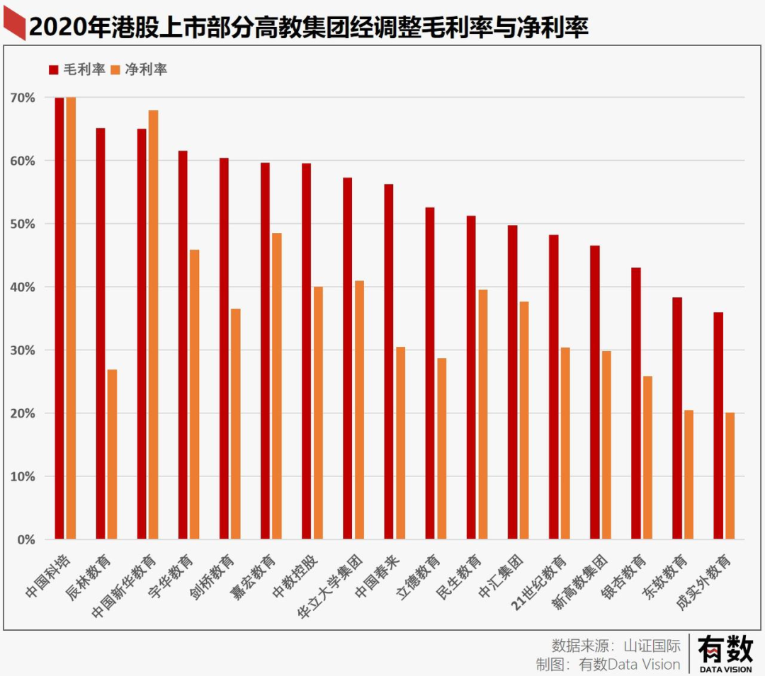 对高教集团来说,主要的经营成本由地租、教师工资等硬性开支组成。这些高教集团的教学水平如何,一定程度上可以通过利润水平来衡量:毛利率越低的公司,很可能在教育上投入了更多的成本。