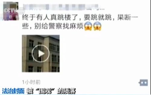 但是楼下的看客在下面高喊:“跳啊,怎么还不跳”;“大家看啊,从一点多跳到六点多,还没跳下来,怂怂把驴都怂栽倒了”,“看完你跳楼,我还要去接娃娃”,“倒是跳啊,坐那儿犹豫什么?”“尼玛呀,楼下好热的,快跳啊,谁不跳跟她舅一辈?”……
