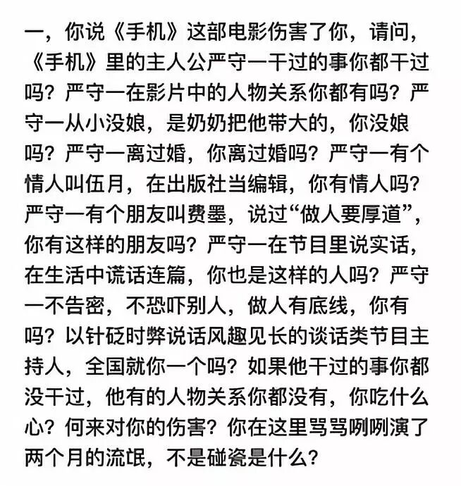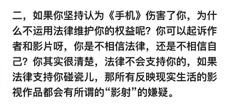 以《手机》伤害了你,为什么不去起诉来回应,这是典型的泼皮无赖嘴脸,正如你当初耍崔永元时就知道,这种伤害控诉无门;另外,这个也可以用于回应你,既然你们也认为崔永元这次伤害到你及家人,为什么不拿起法律武器维护自己权益而是在网上骂街?