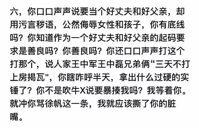 何况真正公然侮辱女性的是你家徐帆老师啊,一个知名演员、大名鼎鼎的公众人物、文艺圈大腕的夫人,竟然在电视节目中洋洋自得地就老公沾花惹草进行精神胜利法炫耀:“反正我们家是男的,吃亏的不是我们,有一个算一个,倒在我们家枪底下,我不吃亏。”这阿Q也学得太象了,徐帆老师作为新时代女性,这不是丢全体女性的脸、对当代全体女性的智商的公然侮辱吗?