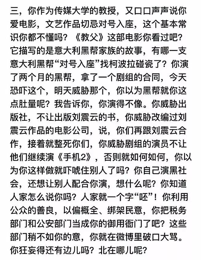 故意以《教父》来影射崔永元是黑帮,但是这条也是自打脸,首先崔是不是黑帮,老百姓心里有数,再者《教父》拍摄过程中,意大利黑帮家族恰恰对号入座,进行了抗议运动和各种阻挠电影拍摄的黑社会骚扰活动,所以这条也是由于无知出的丑。