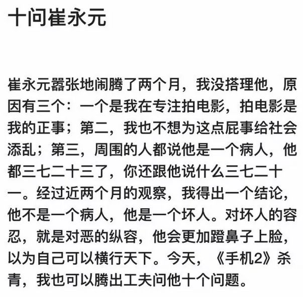 冯小刚“十问崔永元”出来后,舆论一边倒地支持崔永元,网上批驳他的“十问”的文章也数以百计,本来,我不想再凑这个热闹,但看到一段冯小刚在凤凰卫视做谈话节目的视频,才明白了他作为大名鼎鼎的导演、却为何写出“十问”这样低劣的、掩耳盗铃式的回应文章,也明白了他为什么会拍出《集结号》、《芳华》这样误导国人价值观、不知是有意还是无意中充当了西方颠覆华夏文明的走卒。所以,还是说点什么吧。