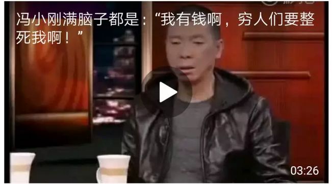 看了这段视频,就不难理解冯小刚为什么会偏执地认为崔永元只是绑架民意,在冯大师眼里,老百姓都是傻X,都是心理不平衡的仇富暴民,都是乌合之众。
