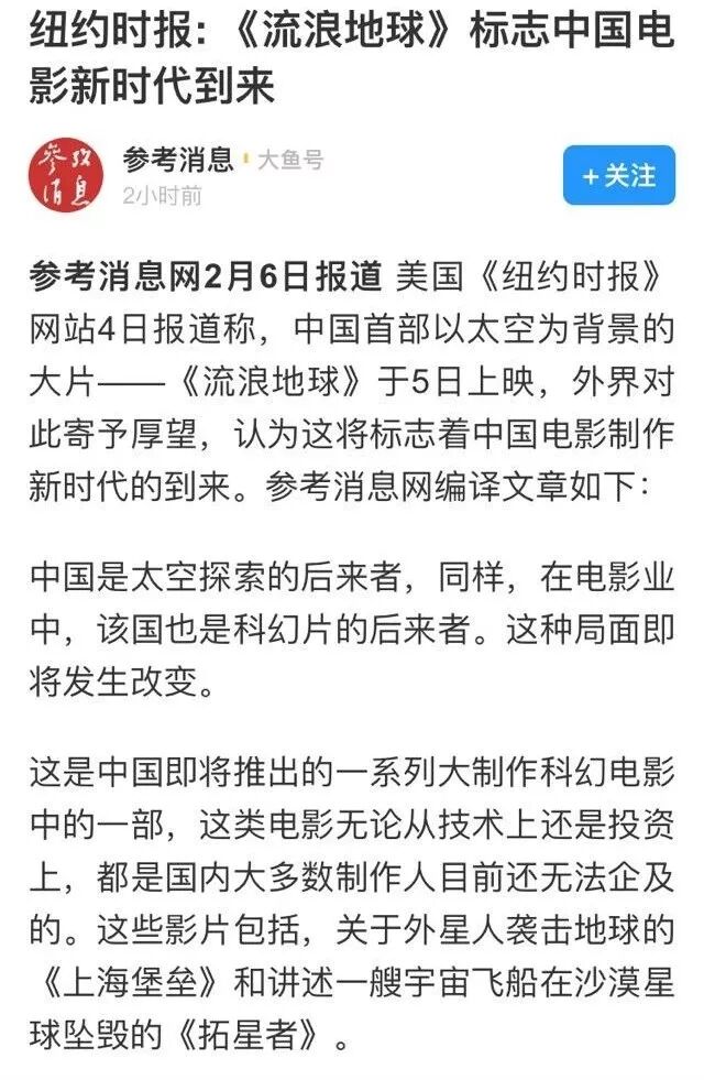 《纽约时报》直接发表了《流浪地球,标志着中国电影新时代的到来》的专题报道。(敲黑板,请大家注意,纽约时报的标题!!!)