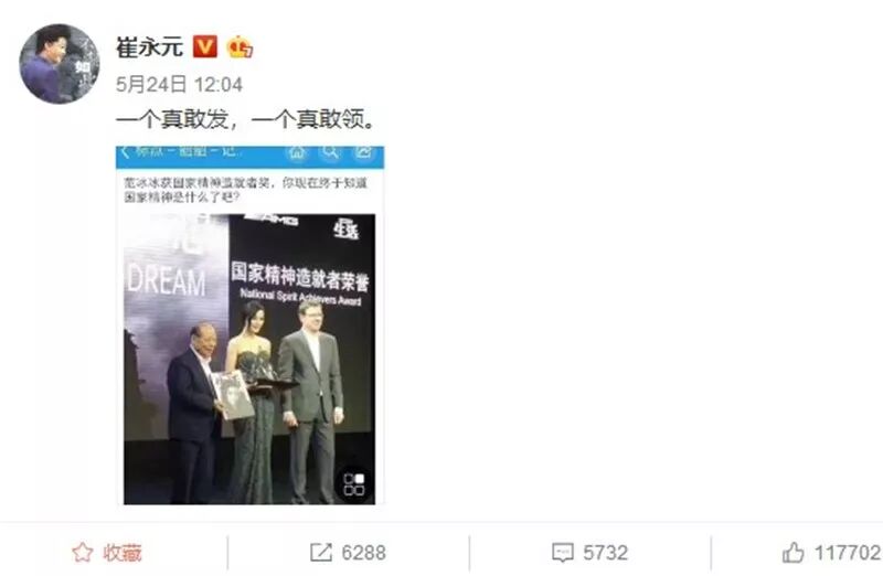 民众无法接受的还有范冰冰竟然领了“国家精神造就者荣誉”,你给老百姓奉献的是什么精神食粮呢?你给年轻人起的是什么偶像示范?老百姓为什么群情激愤、希望国家处置你们这些人而后快?你们自己心里清楚啊!你们拿着天价片酬、偷税漏税,却给老百姓奉献的是黄赌毒,老百姓能不恨你们吗?