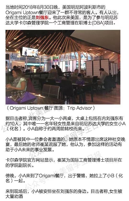 1.小A是半个月前转学过去的,不可疑吗?我们根据前几天《华兴报》社长程汝钊先生的文章披露的事实,刘强东一行去北美的行程计划,早在一个月前已经跟明尼苏达大学的旅行社联系安排过,表明刘的行程安排早已在谋划者掌握中。