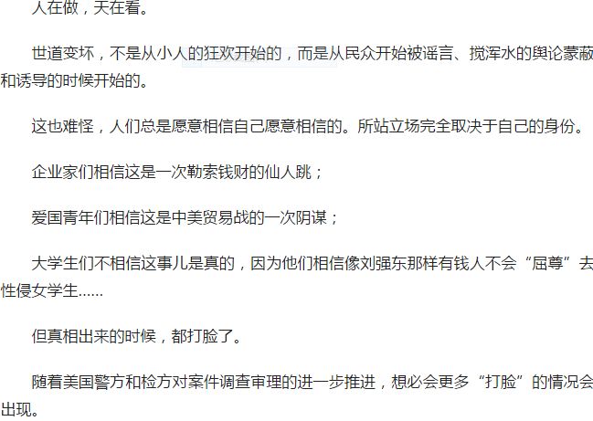 既然有很多人被那篇“刘强东性侵案真相内幕全始末”一文带节奏,因此觉得还是有必要针对该文说一说。