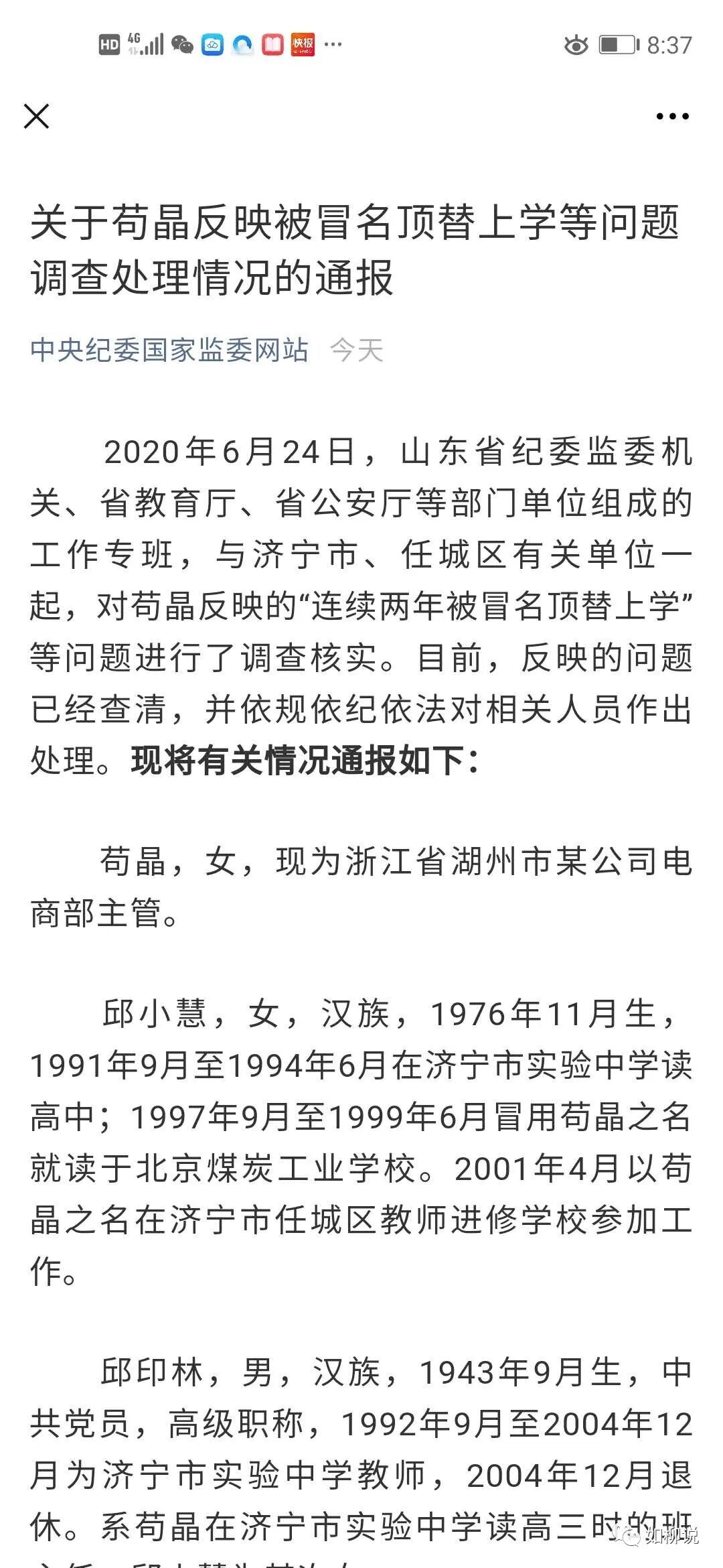 3. 中央纪委的通稿中,为邱老师女儿冒名顶替上学更改档案、姓名、户口的相关责任人都受到了处罚,目前已处罚山东省相关责任人15人,涉及省外人员的正在移交处理。“苟晶两次高考被冒名顶替事件”水落石出,真相大白。媒体在炒作整个事件过程中,正如如柳在上一篇文章所说,不论是苟晶还是媒体,都有隐瞒事实或夸大事实误导读者之嫌。苟晶读的济宁市实验中学并不是济宁市最好的中学,苟晶的学习成绩绝非“学霸”,但是不论是苟晶自己还是媒体,都有意把苟晶往“学霸”人设引,以博得大众的同情;![]()