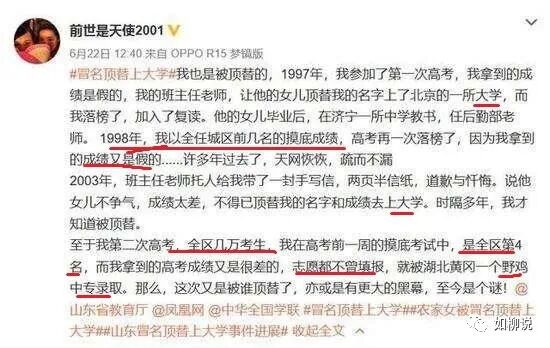 现在为什么有一些人糊涂人依然支持苟晶,就是因为他们以为今天要维护高考公平或正义,必须要打击“冒名顶替现象”或相关腐败,实际上,他们不知道,今天高考公平的症结并不在“冒名顶替”上,这些糊涂人被带节奏,对其它真正损害高考不公平的真实原因根本看不见,由于高考不公平的真实原因被掩盖,其它剥夺普通大众孩子公平教育机会的倾向性政策改革可以更便于暗度陈仓悄悄进行,大众浑然不知,他们攻击的矛头依然在“冒名顶替”这个老黄历上。明白了上述现状,我们就应该明白,苟晶举报高考被顶替应该是出于谋私利而不是出于“公义”,因为举报高考顶替对今天并无多大实际警示意义,何况苟晶对所谓冒名顶替真相早已知情。第一次高考委培中专升学机会是她自己主动放弃的,不存在顶替,而被邱老师女儿冒名上学的真相,她早应该知晓(2003年邱老师写过道歉信);第二次高考,她自己的档案被造假成应届生资格,她也属于规则破坏者。![]()