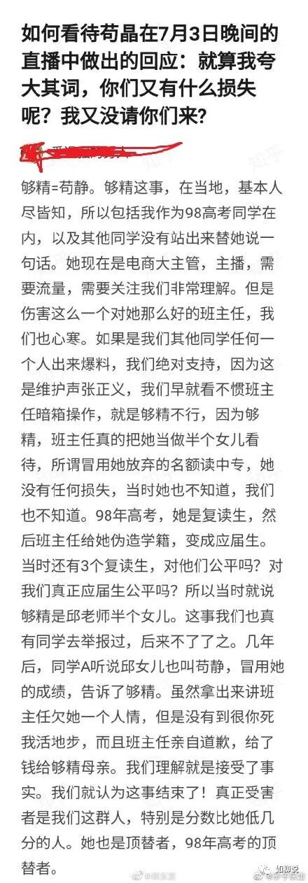 更令人生气的是,这几天总有人私信如柳,反复来跟我探讨这个问题,真是烦不胜烦,不得不再多说几句。有些人认为高考冒名顶替是大恶,苟晶举报了高考顶替,所以她的恶可以宽容;有的人认为邱老师冒名被处罚是事实,所以苟晶的恶可以宽容;有的人认为在古代科举作弊就是要杀头的,所以苟晶的恶可以宽容;有的人甚至认为苟晶不用撒谎欺骗的手法就不能引起关注,所以她的恶可以宽容;有的人认为如柳的文章维护体制,所以如柳是为既得利益者说话……他们的理由五花八门,可见苟晶收割韭菜很成功,那些做了韭菜的人,被卖了还要帮着她数钱。![]()