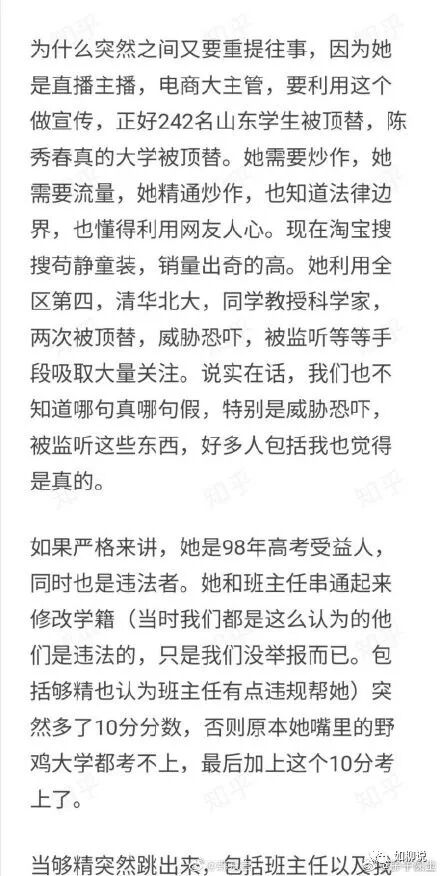 据山东网友说,1998年山东往届生要比应届生高出10分录取,苟晶第二次以应届生参加高考,事实上也参与了破坏高考公平的规则,她有什么公平与正义需要声讨呢?陈春秀是被动发现了被冒名顶替事实引发媒体关注,跟苟晶性质不一样。“苟晶事件”除了处罚邱老师及相关人外,对今天并无多大实际警示意义,因为今天的高考不公平与冒名顶替无关。今天的权贵或精英们直接利用决策权、话语权修改教育及高考政策制度,从政策倾斜上为自己的子女及后代们公开“作弊”,光明正大,不需要违法。因此,那些把“苟晶事件”当做促进公平正义的环节只是自己的一厢情愿,苟晶只不过是与某些媒体坑壑一气,借陈秀春顶替事件掀起的热点趁机炒作罢了,美其名曰是为了维护高考公平与正义,实际都是各怀目的。苟晶要流量,某些公知媒体需要劲爆热点抹黑体制、割裂民众对体制的信任、制造民众间的撕裂与对立。![]()