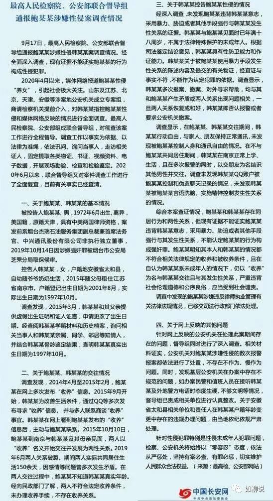 昨天,最高检察院、公安部联合发文通报鲍某明涉嫌性侵少女案调查结果,根据官方通报的调查结果,现有证据不能证实鲍某明的行为构成性侵犯罪。根据官方调查结果,鲍某明事件中的所谓少女韩某某,与鲍某明确立“收养”关系时,实际年龄已经年满18岁,不属于未成年人,韩某某涉嫌违规变更年龄,韩某某的实际出生日期是1997年10月。这个“性侵少女事件”真相大白,实际就是娈童癖遇上了仙人跳骗子,事件双方都不是好东西,这个事件中没有受害者。![]()