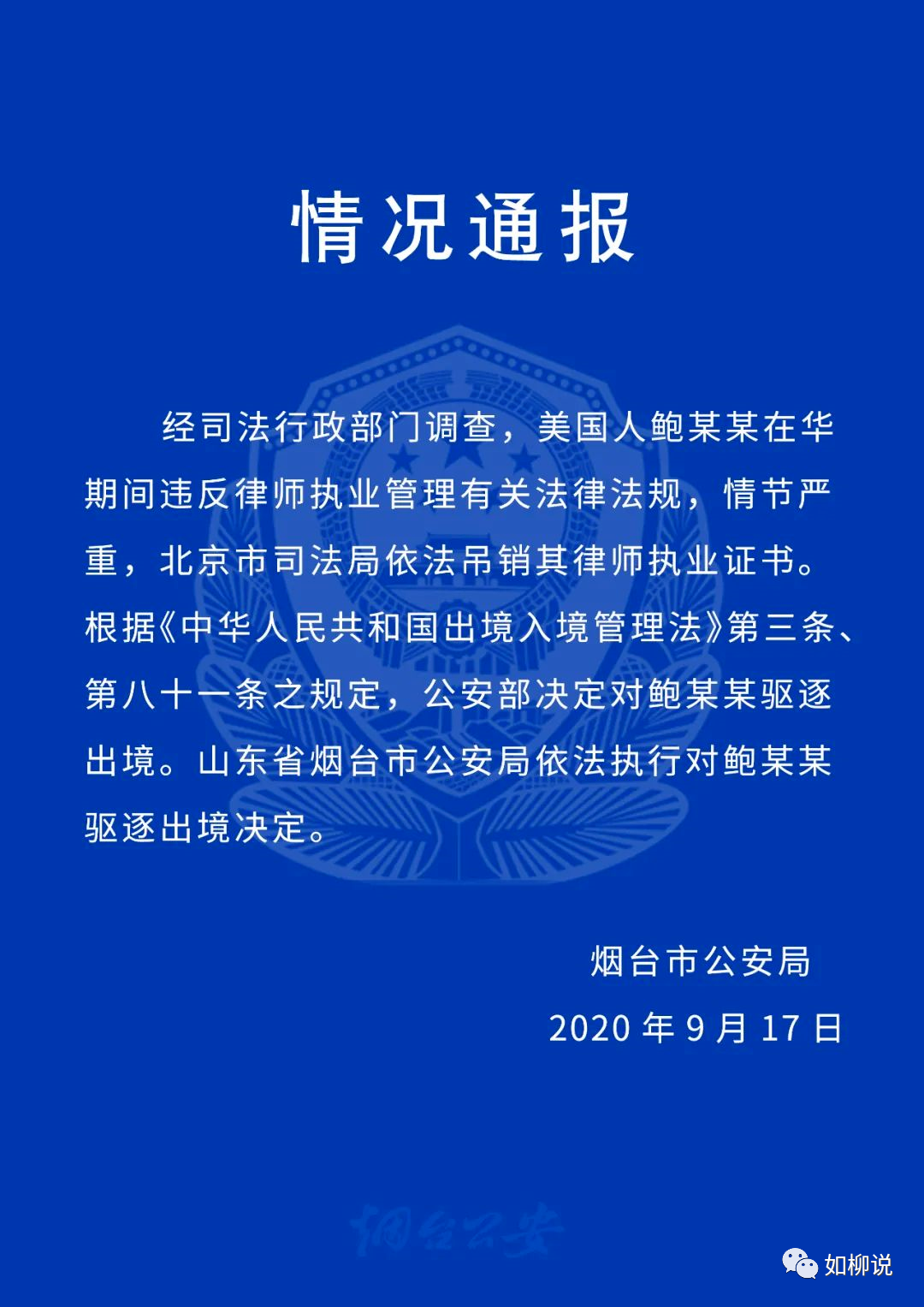 官方通报认为,鲍某明在自认为韩某某系未成年人情况下,仍以“收养”为名与韩某某交往且与其发生性关系,严重违背社会伦理道德和公序良俗,应当受到社会谴责。官方调查发现美国人鲍某明涉嫌违反律师执业管理有关法律法规,据烟台市公安局官方通报,公安部决定对鲍某明驱逐出境,山东省烟台市公安局依法执行对鲍某明驱逐出境决定。