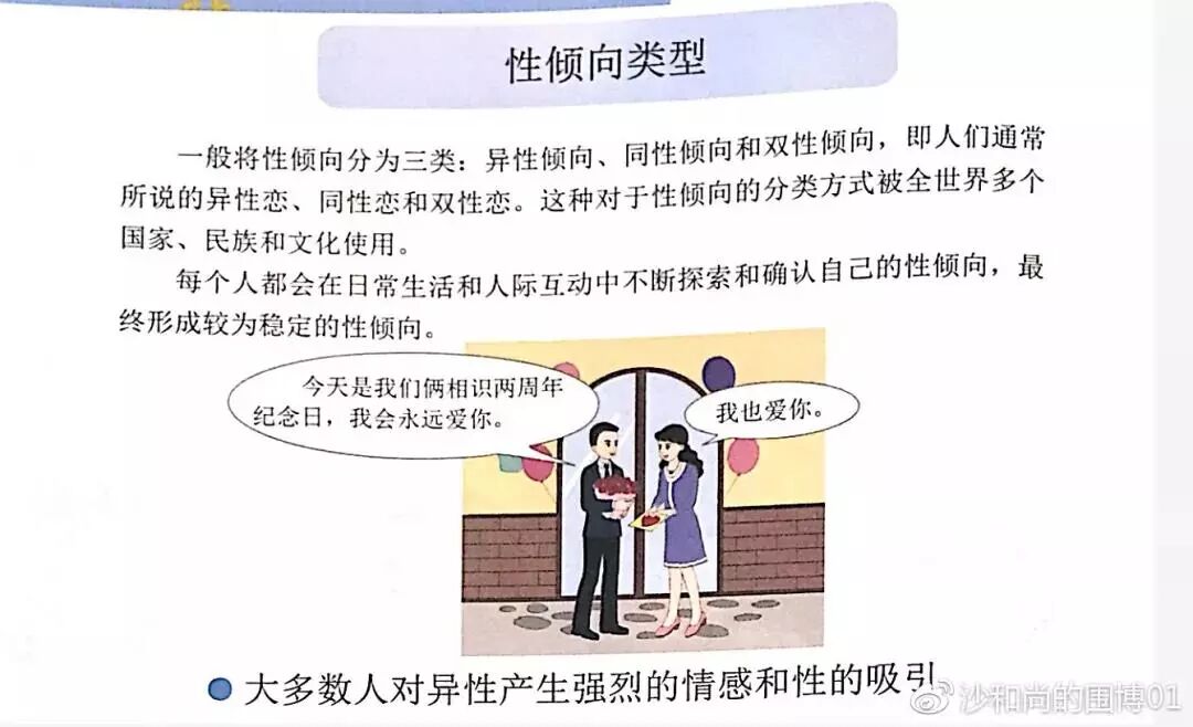 给6年级11-12岁左右的孩子介绍性倾向时,诱导孩子性倾向包括“异性倾向、同性倾向、双性倾向,即人们所说的异性恋、同性恋、双性恋。……每个人都会在日常生活和人际互动中不断探索形成自己的性倾向,最终形成较为稳定的性倾向。”