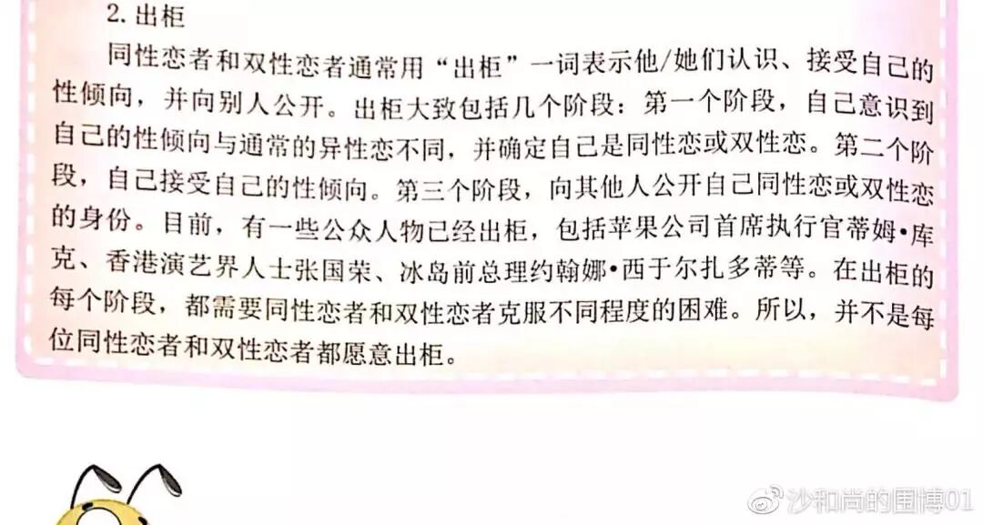 并用很多很显眼的图介绍同性恋、双性恋是怎么回事,并专门解释“出柜”是什么意思,再接着讲了同性婚姻、同性生子等内容。