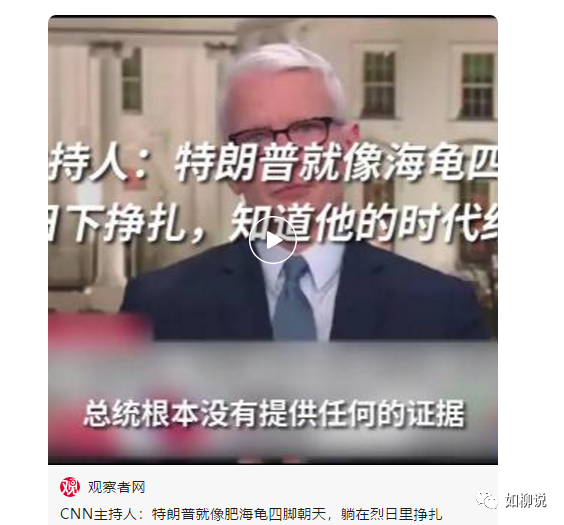 美国有线电视新闻网(CNN)的知名主播安德森.库珀嘲讽特朗普“象一只四脚朝天、在烈日下挣扎的胖乌龟”瞬间被全世界人民津津乐道;