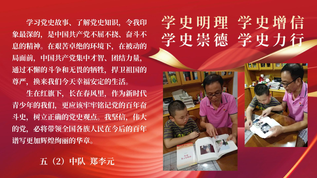 通过党史学习,我真切感受到了在中国共产党的领导下,我们伟大祖国取得的伟大成就和发生的翻天覆地变化,人民的生活水平一天比一天好,国家的实力一天比一天强。作为一名小学生,我要努力学习知识,建设我们伟大的祖国。