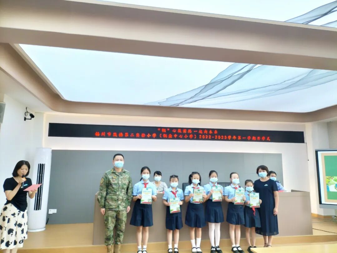 林彤校长和省军区政工局干事乐苏叔叔为各年段代表颁发《铜小兵成长营晋级激励评价手册》,勉励孩子们在“铜小兵成长营”,通过“红领巾奖章”和校“国防章”的争章活动,铸造忠诚、坚毅、克己、进取的军人品质,记录下成长中一段绚丽多姿的历程。