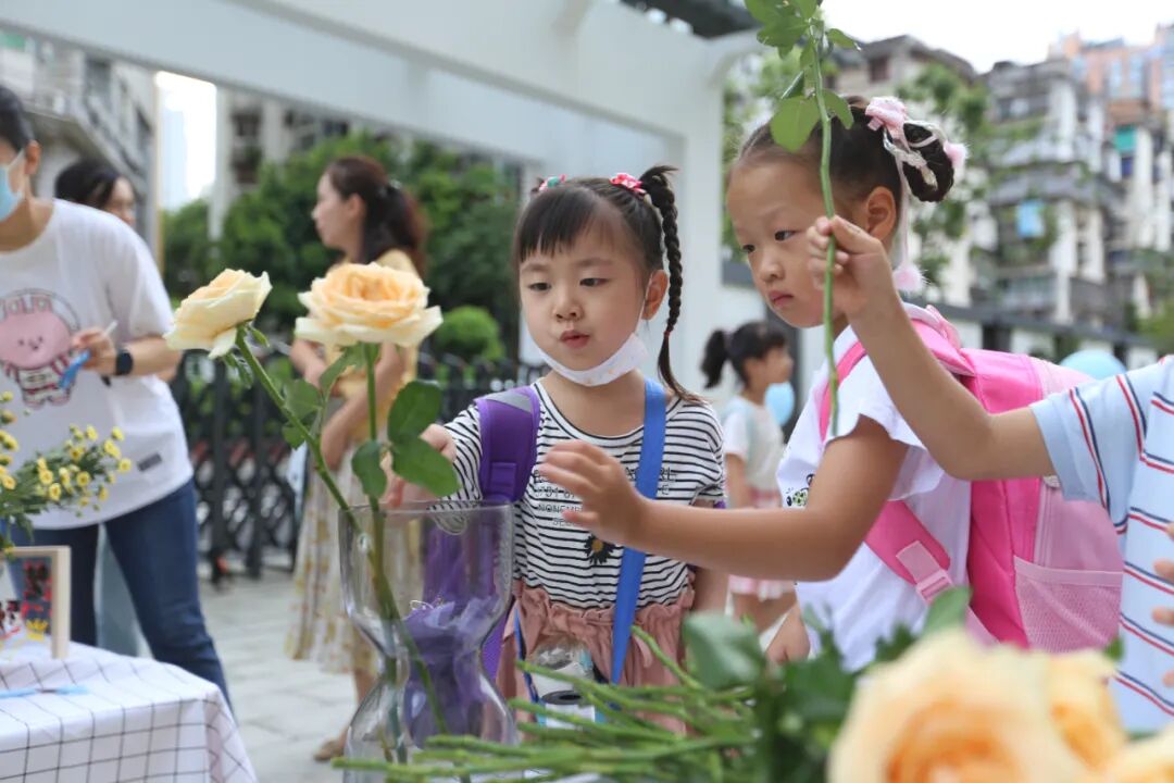 开学第一天,孩子们精心挑选自己喜欢的花朵儿插入自己班级专属的花瓶,大声宣告:我到了!园长老师还为每一位小朋友送上了开学礼物,祝贺成为“延安娃”。
