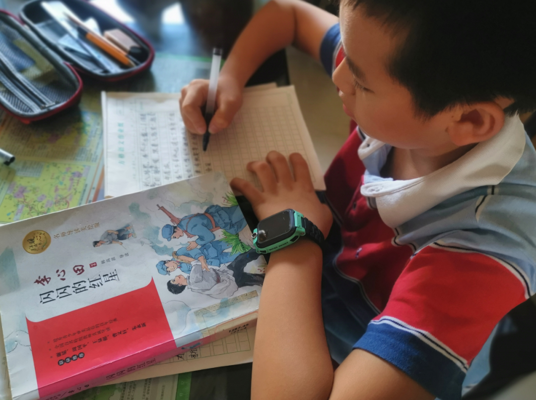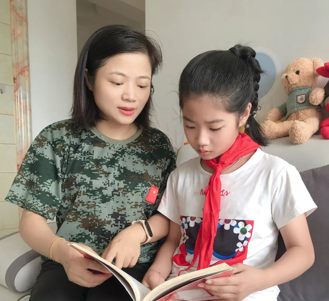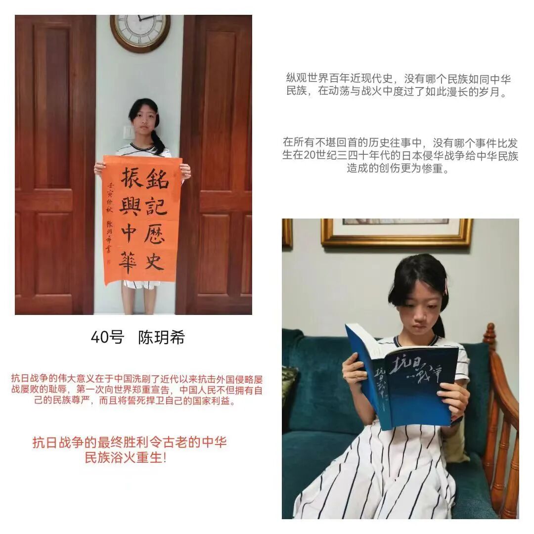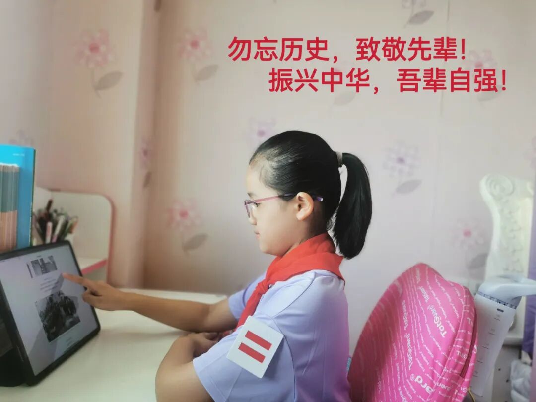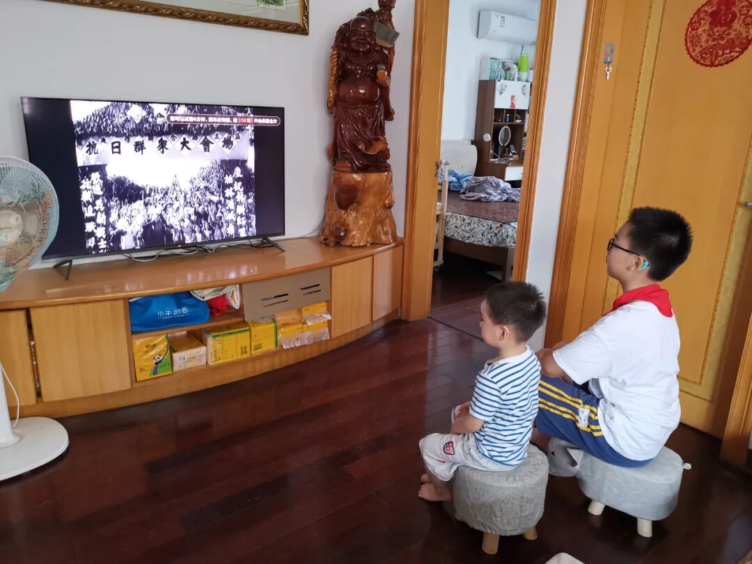 同学们与家人观看爱国电影,透过镜头穿越历史车轮,回顾抗战情景,体悟抗战精神;阅读爱国书籍,再次进入那段红色记忆;参观抗日战争纪念展,重温党的百年光辉历程和波澜壮阔的革命历史。