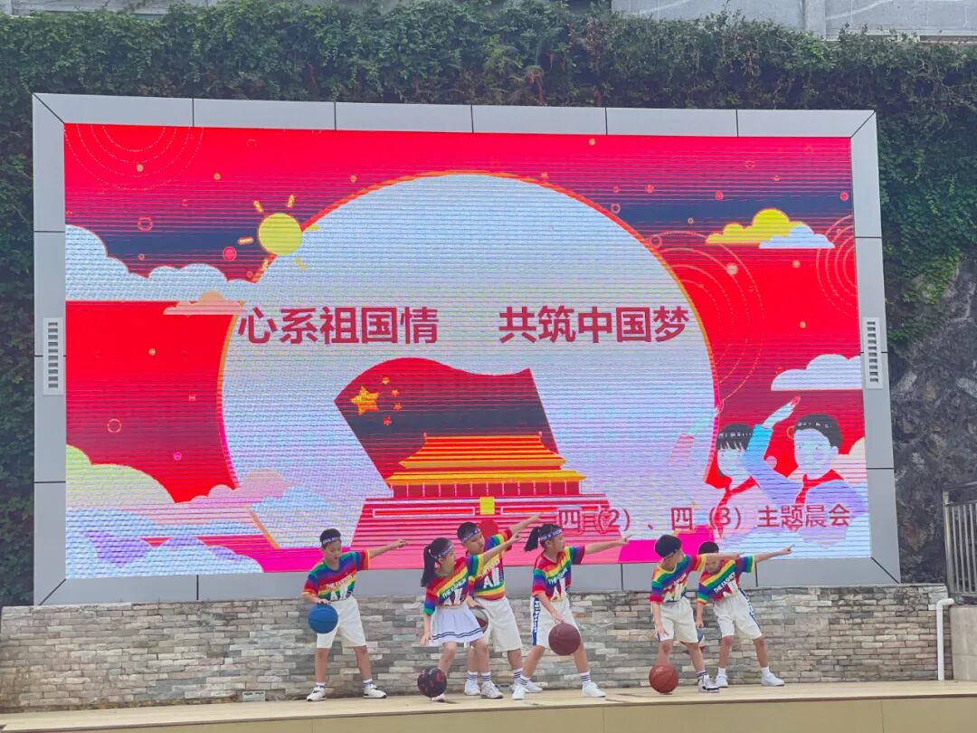 在主题晨会上,同学们以歌曲《名字叫中国》、花式篮球表演等,祝福祖国。