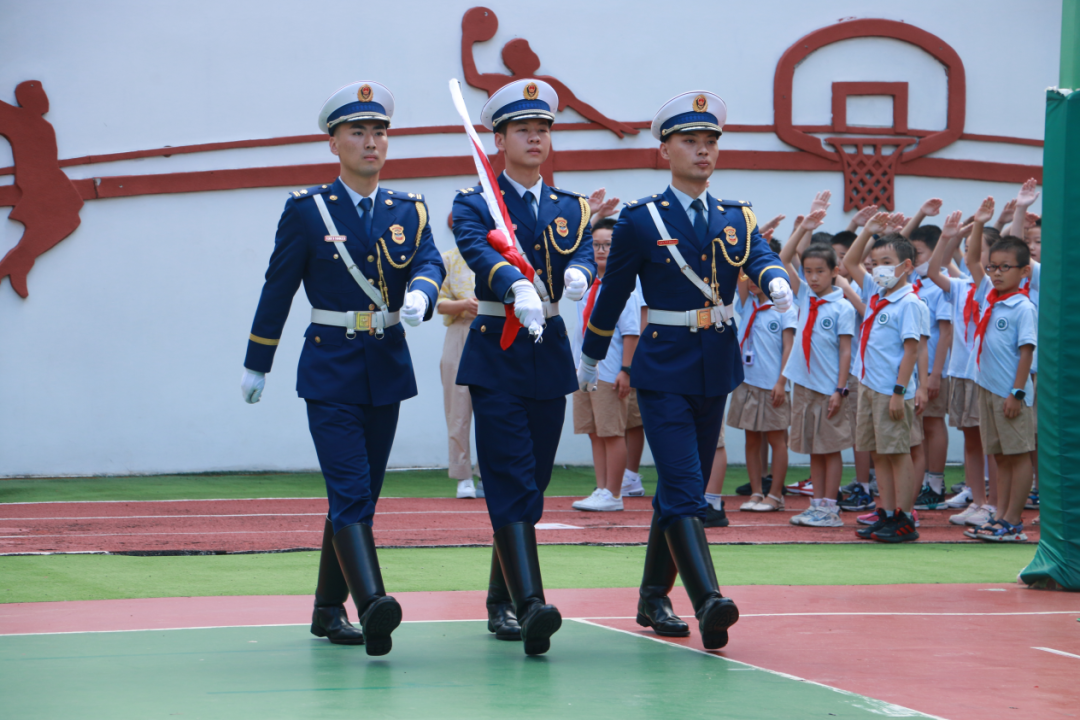 升国旗仪式上,新一届小旗手在国旗护卫班叔叔的带领下,走进会场。全园师生汇聚在一起,用嘹亮的歌声和精彩的表演,抒发了对祖国的热爱之情。