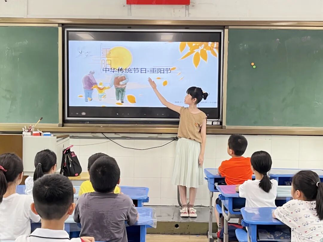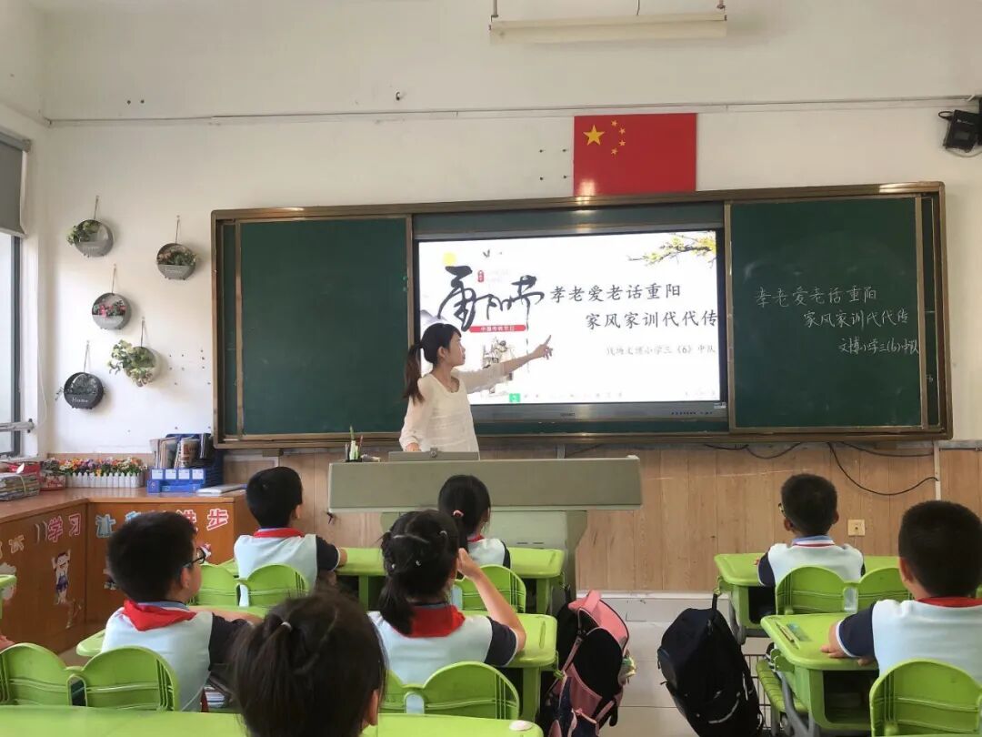 各班开展主题班会,同学们有的吟唱旋律优美的歌曲、诗句,有的讲述重阳节的传统习俗,还有的队员跟大家分享了生活中爱老敬老的图片、事迹,并在会后录制了节日视频。