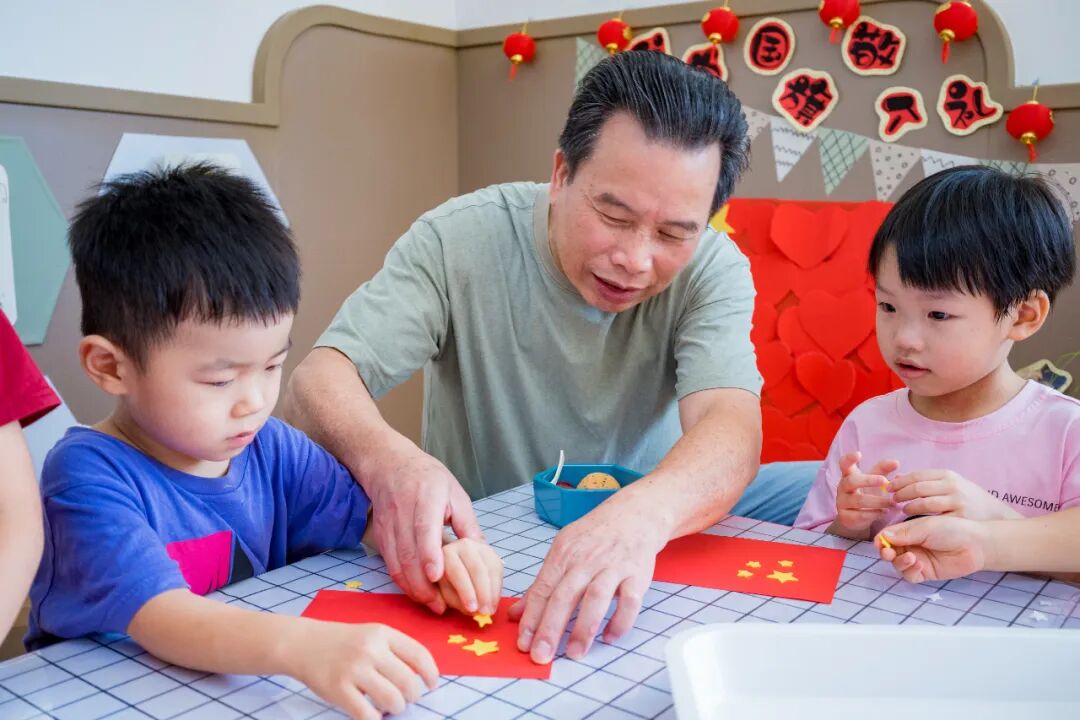 幼儿园邀请爷爷奶奶来园和小朋友们共庆国庆。爷爷奶奶为小朋友们讲红色故事,和孩子们制作五星红旗,孩子们也为爷爷奶奶送上美味的点心,让孩子们从小树立尊老、敬老、爱老的传统美德。