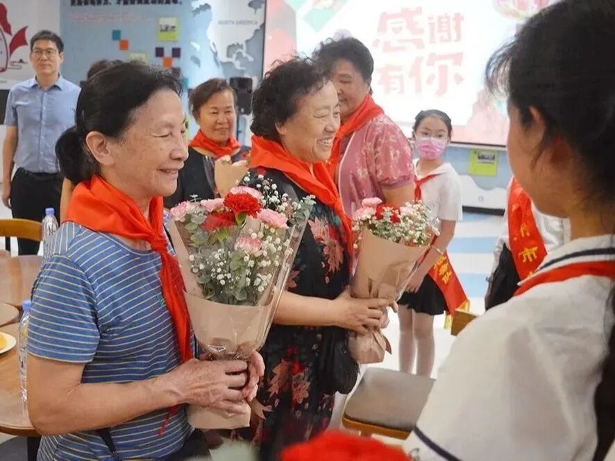 校工会组织退休教师们返校参与活动,少先队代表为退休教师献上红领巾及鲜花,给退休教师们送去温暖。