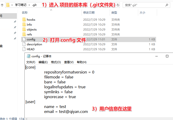 git config 用来设置版本库参数,本质是把输入信息写入到 config 配置文件中(提示:config文件在 .git 目录中有一份 )--local 表示设置的参数只针对此项目生效(只对当前目录下的 .git 版本库生效)user.name 表示 设置 config 文件中的 用户名称user.email 表示 设置 config 文件中的 用户联系方式user_name 和 user_email 是用户自定义的git config 的本质是把输入信息写入到配置文件中。我们可以进入到项目版本库中,打开 config 文件进行验证。.git文件夹中的其他文件夹和文件我们在后续推文中会一一讲解。现在,我们需要知道.git下的 config 文件是 版本库的配置参数文件。