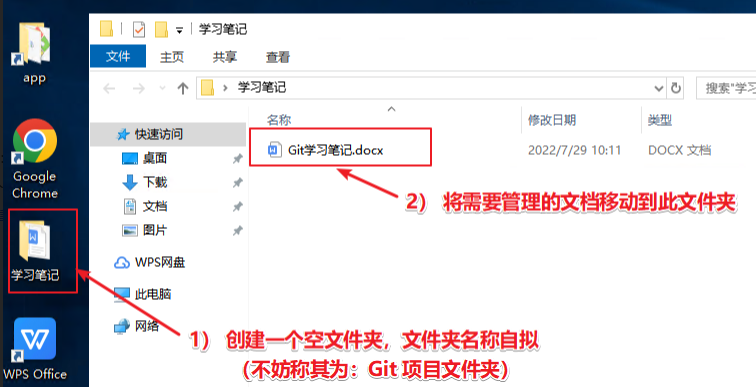 Git学习笔记.docx" 这个文档,先要创建一个空文件夹,把 "Git学习笔记.docx" 放入其中。项目文件夹" ,"项目" 一词更加具体的含义为 "《Git学习笔记.docx》文档的版本控制项目" 。如下图所示:Git学习笔记.docx 中的内容如下图所示,后面的步骤我们会在这个文档中添加和删除内容,并通过Git返回到指定的版本!说明