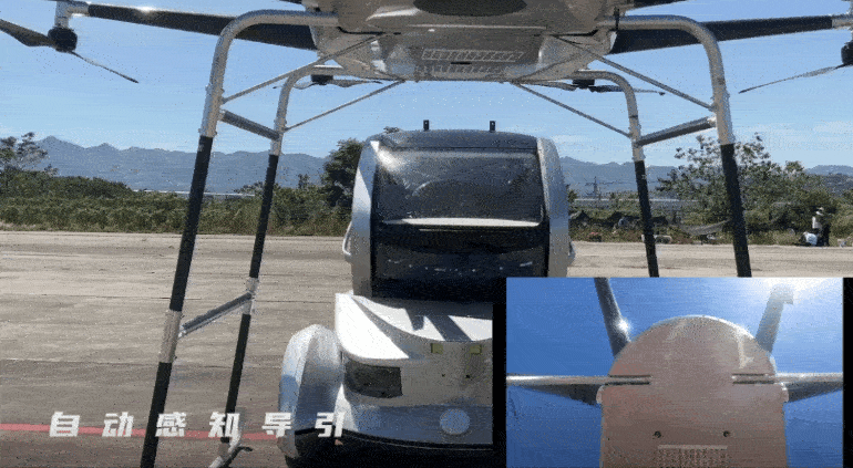 全尺寸轮毂电机四轮驱动底盘,通过综合控制器实现驱动、转向等运动控制及自动驾驶,最大载荷大于500千克,设计最大车速80公里/小时,通过精确感知定位、底盘的轨迹规划和行驶控制,将底盘与座舱或座舱与飞行器精确对准并自动对接、锁固,切换空中飞行、地面行驶两种模式。