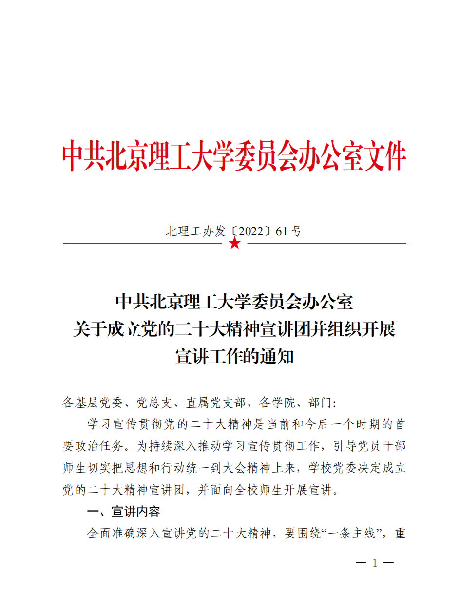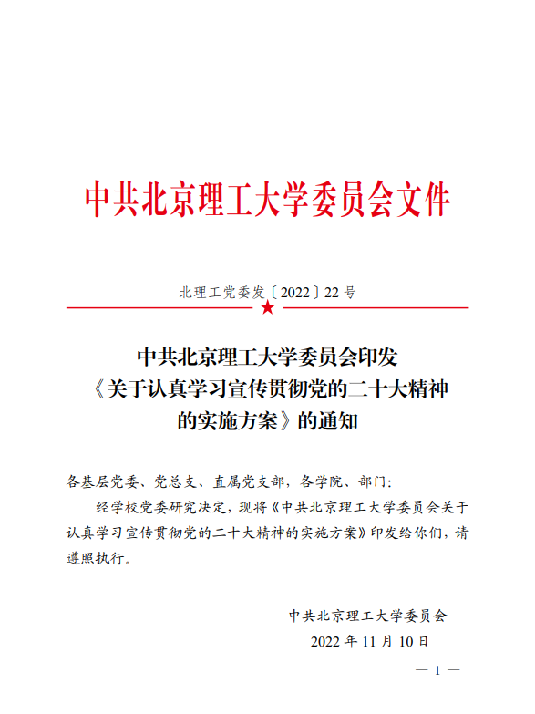 11月4日,学校党委常委会审议通过《中共北京理工大学委员会关于认真学习宣传贯彻党的二十大精神的实施方案》,对持续深入做好党的二十大精神的学习宣传、把党的二十大决策部署贯彻落实到“双一流”建设各方面、全过程作出系统安排,提出明确要求。