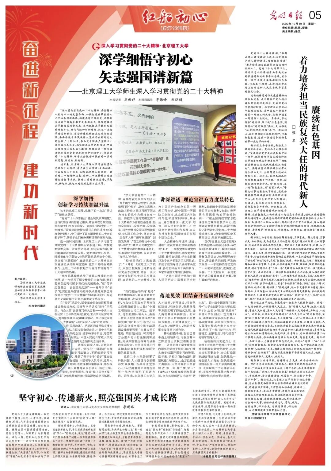 “深入贯彻落实党的二十大精神,要坚持以人民为中心的发展导向,加快打造世界重要人才中心和创新高地,构建具有中国特色、世界影响力的中国高等教育发展新范式;要围绕推进高等教育高质量发展,准确把握高等教育发展的历史方位、时代内涵和创新路径,扛起一流大学建设新责任,为全面建设社会主义现代化国家、全面推进中华民族伟大复兴作出新的更大的贡献。”10月24日,参加完中国共产党第二十次全国代表大会,北京理工大学党委书记、中国工程院院士张军满怀激动,回校后第一时间召开党委常委会暨党委理论中心组学习,传达党的二十大精神,领学大会报告中提出的一系列新思想、新观点、新论断。