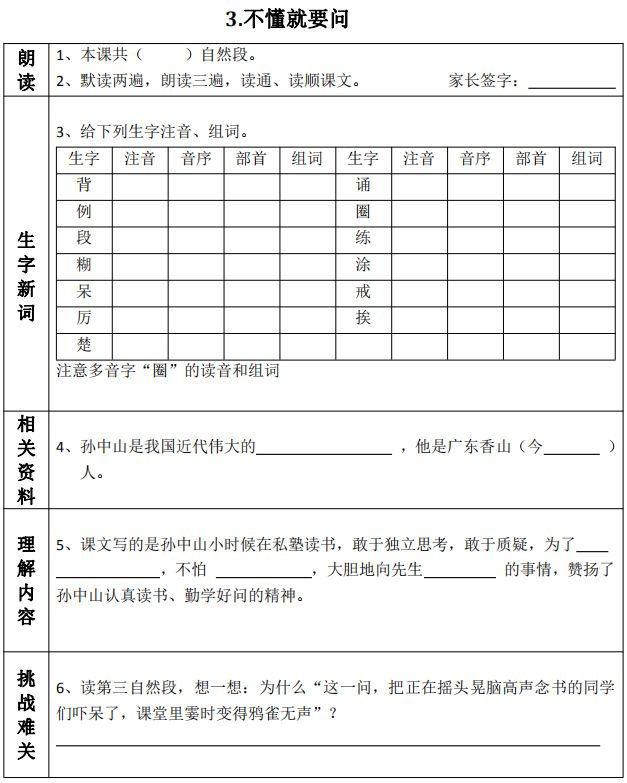 统编版语文三年级(上)课文预习单丨可打印