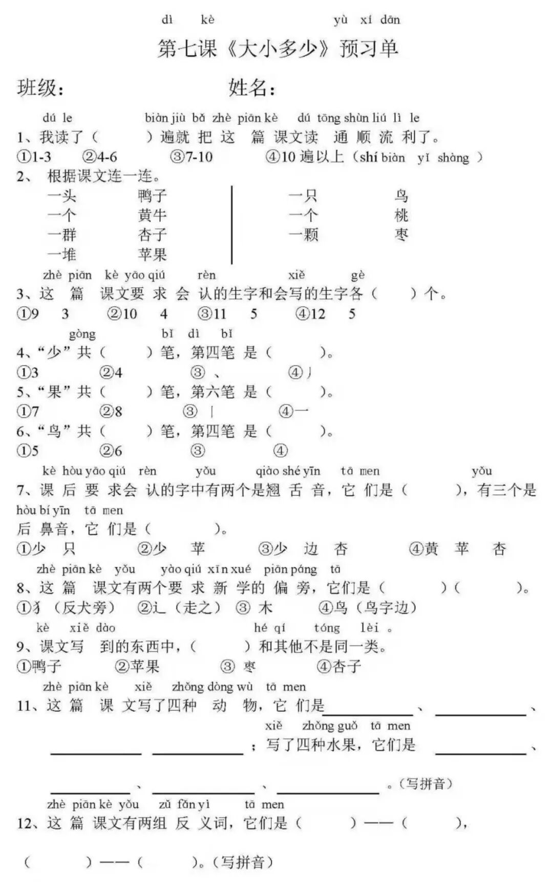 统编版一年级语上册文预习单