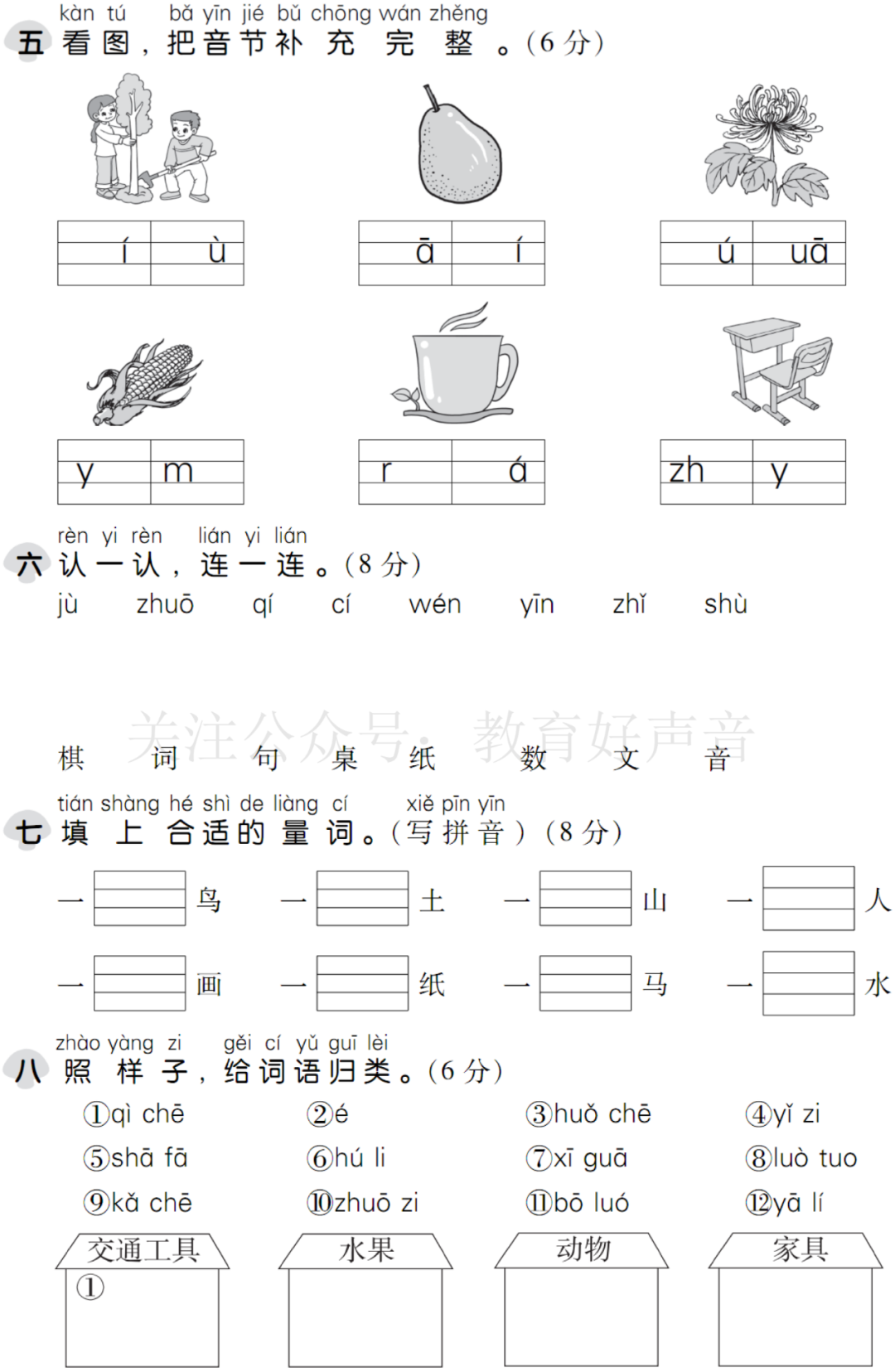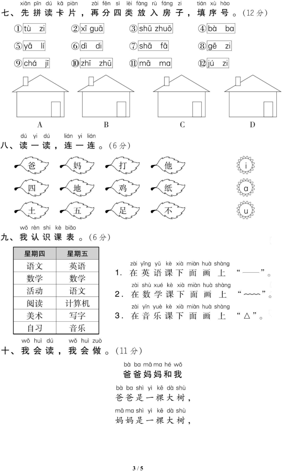 统编版语文一年级(上)第二单元检测卷(含答案)5套丨可打印