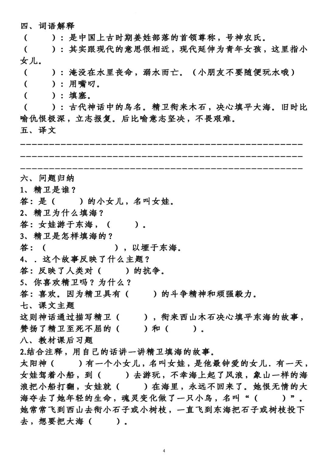 太阳神炎帝有一个小女儿,名叫女娃,是他最钟爱的女儿.有一天,女娃驾着小船,到东海去游玩,不幸海上起了风浪,象山一样的海浪把小船打翻,女娃就淹死在海里,永远不回来了。她恨无情的大海夺去了她年轻的生命,魂灵变化做了一只小鸟,名叫“精卫”。她常常飞到西山去衔小石子或小树枝,一直飞到东海把石子或树枝投下去,想要把大海填平。