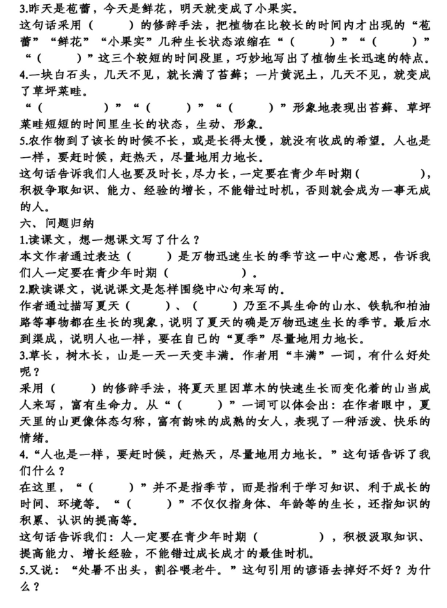 参考答案: 课文15 夏天里的成长 一、给生字注音并组词 棚:péng(棚架、工棚) 苔:tái(苔痕、青苔) 藓:xiǎn(苔藓、青藓) 坪:píng(草坪、坪坝) 蔗:zhè(甘蔗、蔗糖) 瀑:pù(瀑布、飞瀑) 增:zēng(增加、增添) 缝:fèng(缝补、裂缝) 谚:yàn(谚语、农谚) 二、多音字 蔓:wàn(瓜蔓) màn(蔓生) 尽:jǐn(尽管)jìn(尽头) 缝:fèng(缝隙)féng(缝补) 三、近义词 迅速—快速 俗话—俗语 飞快—飞速 丰满—丰盈 增加—增添 尽量—尽力 四、反义词 迅速—迟缓 丰满—干瘪 飞快—缓慢 增加—减少 软绵绵—硬邦邦 五、理解词语 迅速:速度高;非常快。 苞蕾:指没有开放的花骨朵。 苔藓:植物界的一大类,植株矮小,有假根。分为苔和藓两类,有很多种,多生长在阴湿的地方。 丰满:(身体或身体的一部分)胖得匀称好看。本文把山当作人来写。 谚语:在民间流传的固定语句,用简单通俗的话反映出深刻的道理。如“风后暖,雪后寒”“三个臭皮匠,赛过诸葛亮”。 尽量:表示力求在一定范围内达到最大限度。 六、句子解析 1.生物从小到大,本来是天天长的,不过夏天的长是飞快的长,跳跃的长,活生生的看得见的长。 生物在夏天成长的共同特点是非常迅速,从“生物从小到大,本来是天天长的,不过夏天的长是飞快地长,跳跃地长,活生生地看得见的长。”这句话说明了这一特点。 2.你在棚架上看瓜藤,一天可以长出几寸;你到竹子林、高粱地里听声音,在叭叭的声响里,一夜可以多出半节。 这句话写“看见”“听见”了植物的生长,短短“一天”“一夜”的生长,更突出了植物长得飞快的特点。 3.昨天是苞蕾,今天是鲜花,明天就变成了小果实。 这句话采用排比的修辞手法,把植物在比较长的时间内才出现的“苞蕾”“鲜花”“小果实”几种生长状态浓缩在“昨天”“今天”“明天”这三个较短的时间段里,巧妙地写出了植物生长迅速的特点。 4.一块白石头,几天不见,就长满了苔藓;一片黄泥土,几天不见,就变成了草坪菜畦。 “几天不见”“长满”“变成”形象地表现出苔藓、草坪菜畦短短的时间里生长的状态,生动、形象。 5.农作物到了该长的时候不长,或是长得太慢,就没有收成的希望。人也是一样,要赶时候,赶热天,尽量地用力地长。 这句话告诉我们人也要及时长,尽力长,一定要在青少年时期珍惜时间,积极争取知识、能力、经验的增长,不能错过时机,否则就会成为一事无成的人。 六、问题归纳 1.读课文,想一想课文写了什么? 本文作者通过表达夏天是万物迅速生长的季节这一中心意思,告诉我们人一定要在青少年时期珍惜时间。 2.默读课文,说说课文是怎样围绕中心句来写的。 作者通过描写夏天植物、动物乃至不具生命的山水、铁轨和柏油路等事物都在生长的现象,说明了夏天的确是万物迅速生长的季节。最后水到渠成,说明人也一样,要在自己的“夏季”尽量地用力地长。 3.草长,树木长,山是一天一天变丰满。作者用“丰满”一词,有什么好处呢? 采用拟人的修辞手法,将夏天里因草木的快速生长而变化着的山当成人来写,富有生命力。从“丰满”一词可以体会出:在作者眼中,夏天里的山更像体态匀称,富有韵味的成熟的女人,表现了一种活泼、快乐的情绪。 4.“人也是一样,要赶时候,赶热天,尽量地用力地长。”这句话告诉了我们什么? 在这里,“热天”并不是指季节,而是指利于学习知识、利于成长的时间、环境等。“长”不仅仅指身体、年龄等的生长,还指知识的积累、认识的提高等。 这句话告诉我们:人一定要在青少年时期珍惜时间,积极汲取知识、提高能力、增长经验,不能错过成长成才的最佳时机。 5.又说:“处暑不出头,割谷喂老牛。”这句引用的谚语去掉好不好?为什么? 不好。作者引用“处暑不出头,割谷喂老牛”表达生长要趁最适宜的时机赶快长,时不待人的意思,语言生动活泼。 七、课文分段 第一部分(1):概括介绍夏天是万物迅速成长的季节。 第二部分(2-3):写夏天里植物、动物、山、地、河和铁轨、柏油路都在快速地成长。 第三部分(4):写夏天里人也要赶时候,尽量地长。 八、课文主题 本文作者通过表达夏天是万物迅速生长的季节这一中心意思,告诉我们人一定要在青少年时期珍惜时间,积极进取,获取知识,提高能力,不能错过时机,否则就会成为一事无成的人。 九、教材课后习题 1.默读课文,找出全文的中心句,说说课文是怎样围绕中心句来写的。 课文的中心句是“夏天是万物迅速生长的季节。”作者通过描写夏天植物、动物乃至不具生命的山水、铁轨和柏油路等事物都在生长的现象,说明了夏天的确是万物迅速生长的季节。最后水到渠成,说明人也一样,要在自己的“夏季”尽量地用力地长。 2.课文第2自然段写出了生物在夏天里飞快生长的状态。读一读,说说写到了哪些动植物,是怎样体现这一段的中心意思的。 第2自然段主要写了棚架上的瓜藤、竹子、高梁、 苞蕾、苔藓、草、蔬莱等植物, 以及小猫、小狗、小鸡、小鸭等动物。通过描写这些动植物在夏季的快速生长,突出了生物在夏天里飞快生长的状态。 课文16盼 一、给生字注音并组词 袖:xiù(领袖、衣袖) 篷:péng(帐篷、斗篷) 缩:suō(缩写、缩短) 疯:fēng(疯狂、发疯) 瓦:wǎ(瓦片、瓦房) 柜:guì(柜子、衣柜) 喧:xuān(喧闹、喧哗) 甩:shuǎi(甩开、甩掉) 嚷:rǎng(叫嚷、吵嚷) 酱:jiàng(酱油、果酱) 唇:chún(嘴唇、红唇) 