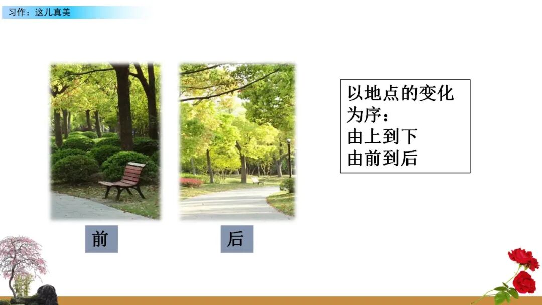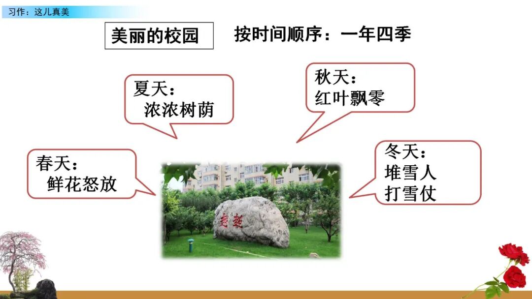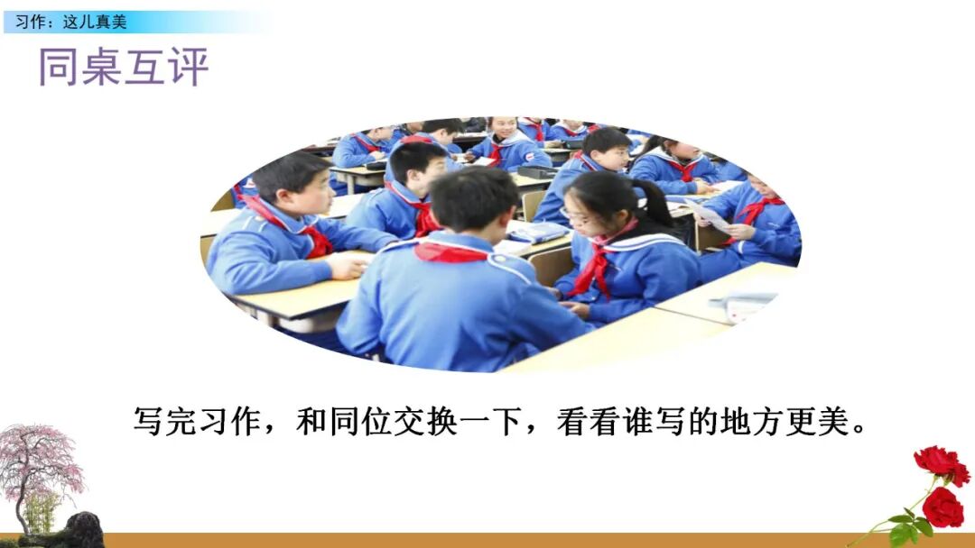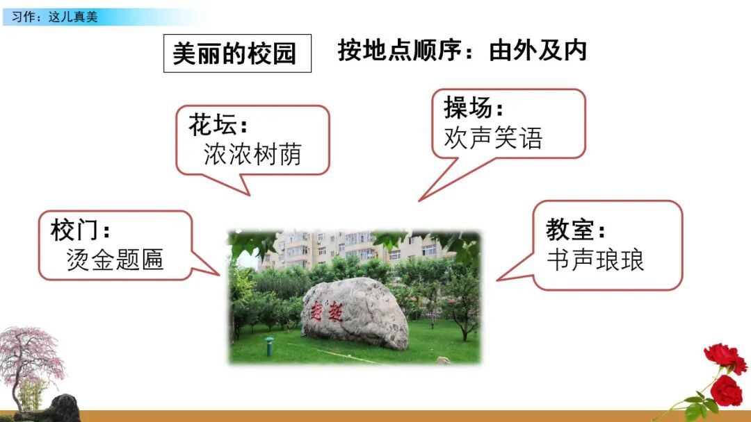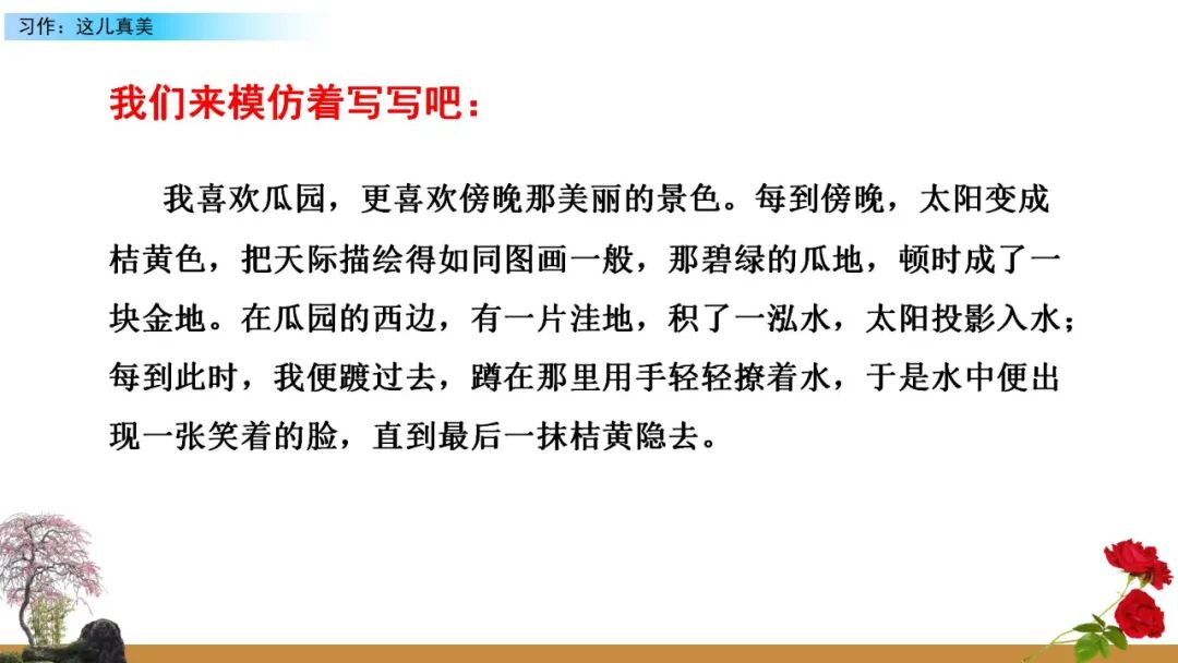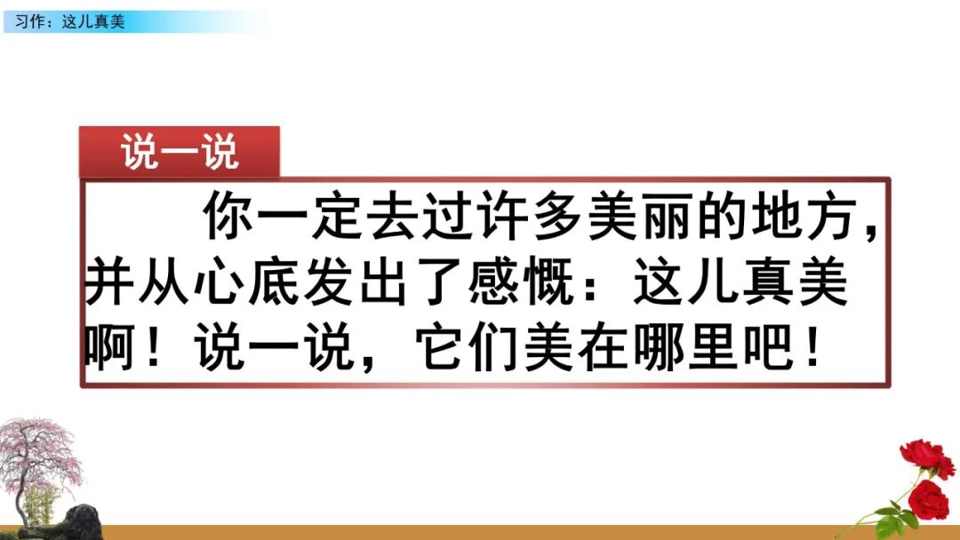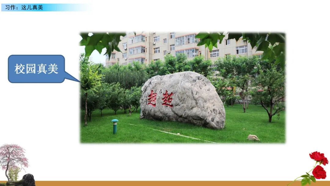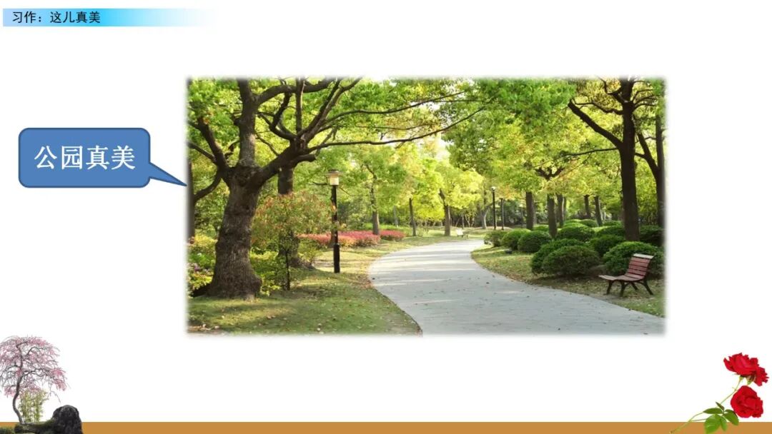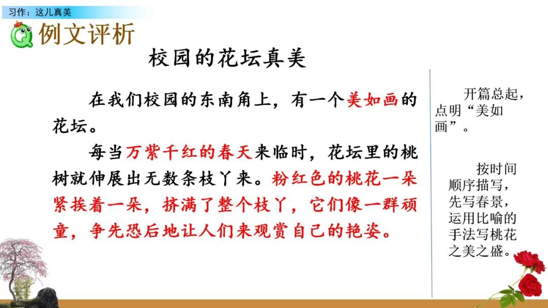 啊!这儿真美!啊!这儿真美! 春姑娘的脚春姑娘的脚步离我们越来越近 ,春光明媚,春色满园,这时正是小桃园最旺盛的时候。那里的景色如诗如画,简 直 就是世外桃源。在那里你会觉自己都飘飘欲仙了。 小桃园座落在城墙下,刚走进门口就有一个庞大的石块。上面刻着几个钢筋有力的大字“小桃园”。在往深处走的时候,你会看到一条条蜿蜒的小路,到处回荡着孩子们的欢声笑语,旁边还有一条沟渠,在蓝天的映衬下,显得很清澈。眺望一看,还有许多的运动器材,其中,我最喜欢丛林迷宫。那时,我和闫鲁林,汤研,徐子冉,本该闫鲁林抓,我们跑了一会儿,累了,坐在椅子上休息,而闫鲁林 以为我们还在里面在里面跑,跑得累死了。那里的草地很宽敞可以做游戏。 小桃园呀!小桃园!重要的还是桃花,桃花的形状千姿百态,有的露出了笑脸,有的绽开了花苞,香味很迷人,当我走进小桃园时就闻到了一股清新的香味。颜色有红的,有粉红,有紫的等等。 这儿的景色非常美真是无法形容了,下次我还要来,我都有点不想回家了! 点评:这篇文章描写了小桃园美丽的景色,抒发了小作者对小桃园的喜爱之情。文章采用总分总的结构,脉络清晰有条理;内容上对桃花进行了详细的描写如“重要的还是桃花,桃花的形状千姿百态,有的露出了笑脸,有的绽开了花苞,香味很迷人,当我走进小桃园时就闻到了一股清新的香味”,安排合理详略得当。 校园一角 我最喜欢校园里的花坛了,它春、夏、秋、冬无不迷人,是个美丽的方。 当春姑娘来到时,花坛变了。小树换上了新的绿装,在沃土里睡了一冬的种子吸饱了甘甜的雨露,向外探出头来,好奇的打量着美丽的世界。 夏天,树林的枝叶长的葱葱茏茏、密密层层的,小草长的很壮很壮,远处看,像绿色的地毯。我和同学们在草地上快乐地玩耍。 秋天,小草像失去水分了,变得枯黄了。小树的叶子有红有黄,纷纷落下时,像一只只美丽的小蝴蝶。我们每人拾一片好看的叶子,做了一个书签。 冬天,大雪纷纷落下,落在花坛里的小树杈上,落在了又松又软的沃土上。下课了,小伙伴们在花坛里打雪仗,好不热闹。 我爱学校,但我更喜欢美丽的花坛。 这儿真美 这真是一个美丽的地方。 天空是那么的干净,透亮,好像一块用清水洗过的蓝宝石一样。蓝天上飘着几朵白云,有时像翩翩起舞的蝴蝶,有时像自由自在飞翔的小鸟,有时像在水里欢快游动的小鱼。一群群大雁在飞往远方,有时排成一字形,有时排成人字形。 远处,有一座座大山,一山绿,一山青,一山浓,一山淡,真像一副优美的山水画。一棵棵松树好像坚强的士兵一样,守护着大山。 远处的草地绿油油的,草地上还有几只小白兔,一会儿跳到东,一会儿跳到西,一会儿跳到北,一会儿跳到南,它们真高兴啊。几条小鱼在水中欢快地游着。它们有时在水中转圈圈,有时停下来,游着游着,小鱼好像发现了敌人一样,飞速钻到水里不见了。水中还有几只大螃蟹,举着威武的大钳子,好像在比谁厉害。 啊,这里真美啊! 点评:文章开篇点题,“这真是一个美丽的地方”开启下文,下文具体叙述这儿怎么美,最后直接抒情,文章布局很好。语言优美,运用比喻和排比的修辞手法把美景描写得形象生动,很好。 这儿真美 一个风和日丽的早晨,我来到郊外游玩,郊外的景色真美呀! 天空一望无边,上面飘着几朵白云,这些白云千姿百态,变化多端。 远处是一片群山,这些山层层叠叠、连绵起伏、形态各异,一山绿,一山青,一山浓,一山淡,真象一幅优美的山水画! 山脚下是一片树林,一棵棵树木高大挺拔、郁郁葱葱,树叶密密麻麻、翠色欲滴,就象一朵朵绿色的云, 大地升起。忽然传来几声清脆的鸣叫,原来是一群不知名的鸟儿,它们拍打着翅膀,在空中盘旋,好象在寻找着什么。不一会儿,它们放下起落架,慢慢的降落在地面上。哦,它们找到了栖息的家园。 树下绿荫荫的草地生机勃勃。一阵风吹过,小草欢快地跳起了摇摆舞。草地上的野花各种各样,竞相开放,一丛丛,一簇簇。五彩缤纷,黄的赛金,红的似火,粉的如霞,白的像雪……花儿摇曳着美丽的身躯,散发出沁人心脾的芳香。一只只小蜜蜂被花儿吸引住了,“嗡嗡嗡”地叫着,一会儿飞到这朵花,一会儿飞到那朵花。一群群蝴蝶翩翩起舞,飞来飞去。 弯弯的小河伸向远方,小河清澈见底,如同一条透明的蓝绸子,静静地躺在大地的怀抱里。一阵风吹过,河面泛起了波纹。几条小鱼在河里快活地游着。它们有时停下来,有时在水里转圈圈。游着游着,小鱼好像发现了敌人似的,迅速钻到深水里不见了。 我被眼前的景象吸引,呼吸着清新的空气,感觉心旷神怡,情不自禁地赞叹道:“啊!这儿真美呀!” 点评:这是一篇描写郊外美景的文章。文中对郊外的山、草、蝴蝶、小河等景物进行了细致生动的描写,描绘了一幅美丽的画面。特别是对山的描写,采用由远及近的方法,很不错。 我爱美丽的家乡 这儿真美 春天的校园真美 春姑娘来了,她带着生命与希望悄悄走进校园,校园顿时充满了生机与喜悦。 瞧,草地上那些可爱的小草悄悄的织起了一块绿色的毯子。迎春花也禁不住春天的诱惑,打开一扇扇金黄的窗户,吸收新鲜空气,感受春天的温暖。 桃花也含苞欲放,好像马上就要绽开一样。但有一些桃花已经开满了枝头,远远望去,好像一朵朵红色的云一样。柳树悄悄的抽出嫩绿的枝条,春风一吹,柳树的头发就像跳起了摇摆舞。 校