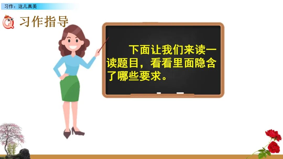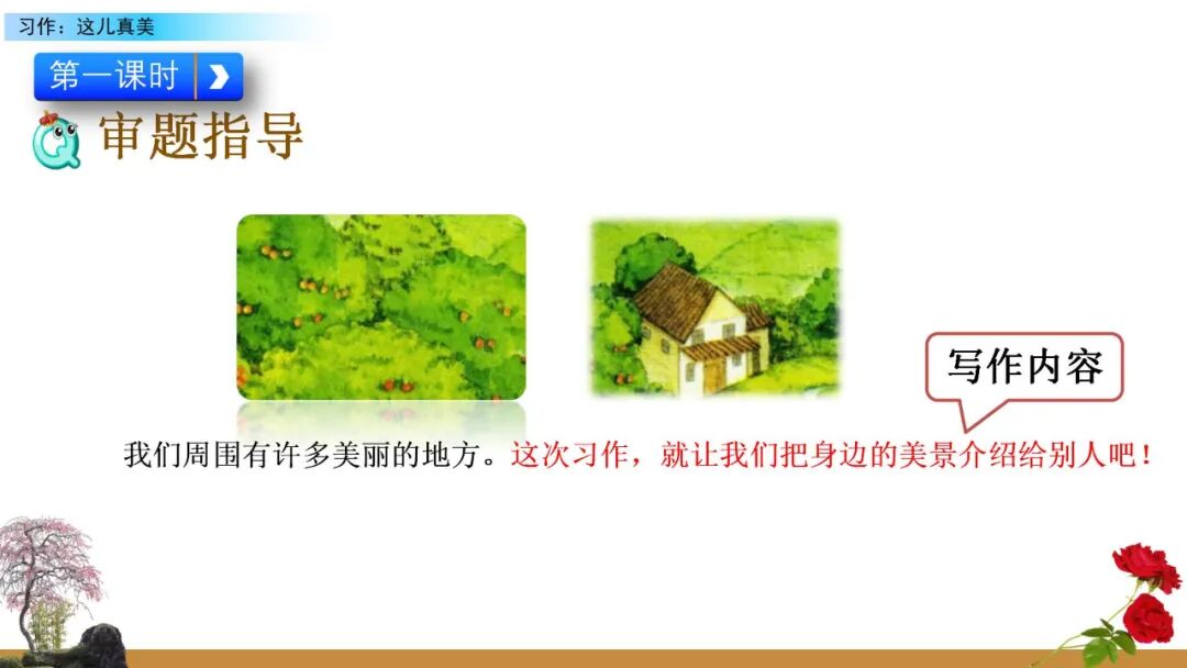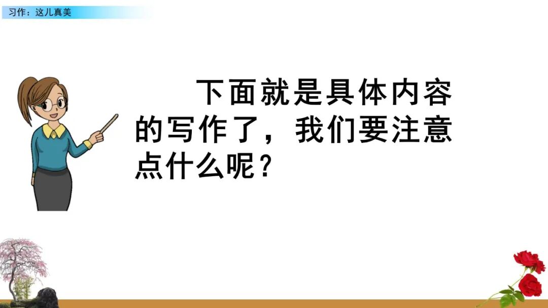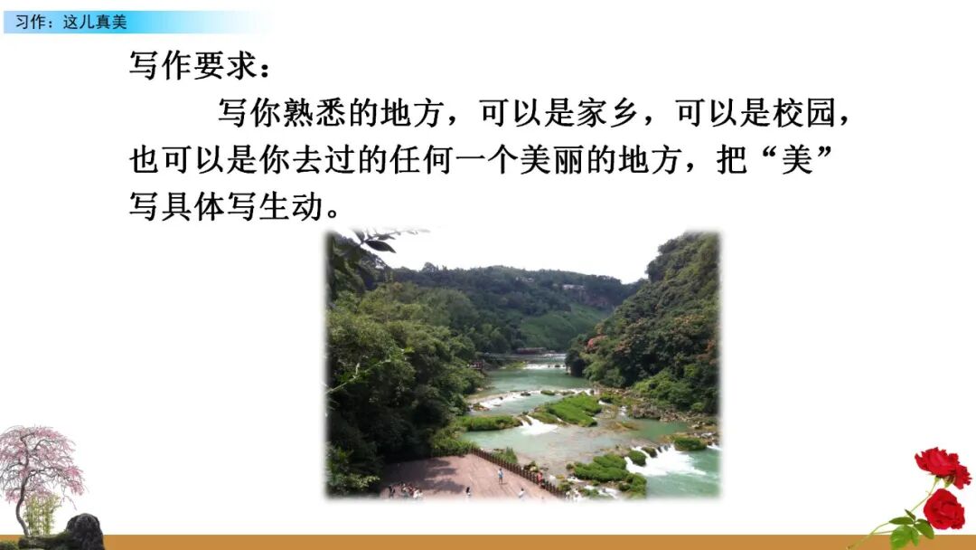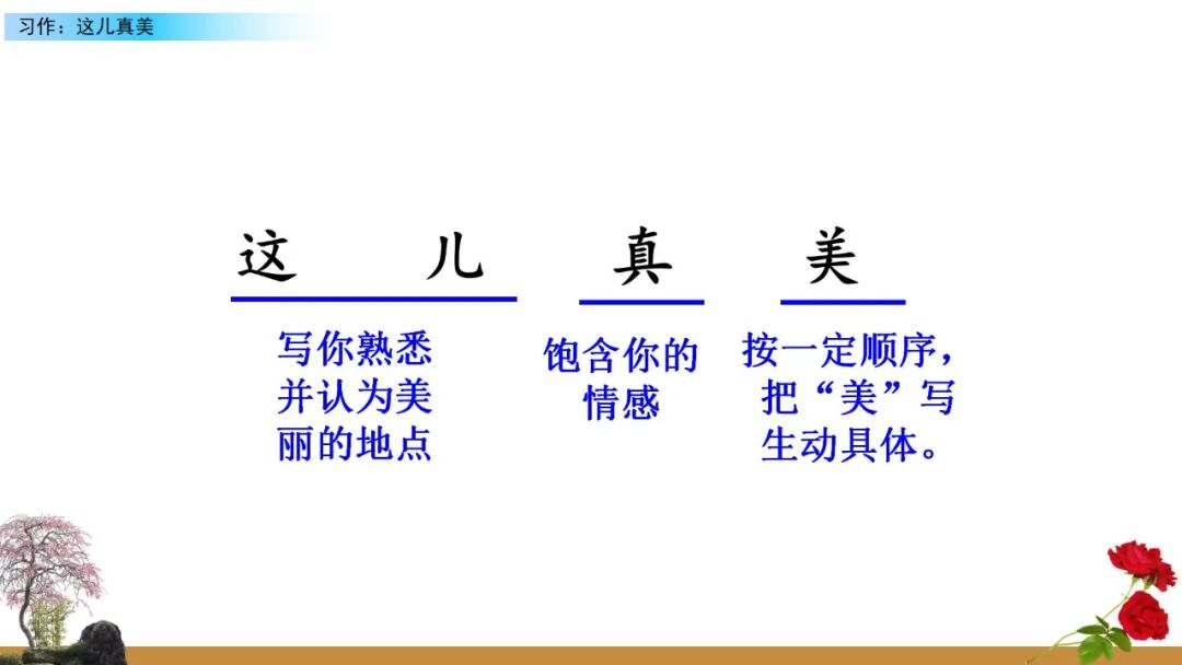一、写作要求: 1.能仔细观察一处景物,并运用围绕一个意思写的方法进行写作,能主动运用平时积累的描写景物的词语。 2.能自己改正错别字,并乐于和同伴分享观察到的美景。 二、审题。 本次习作的重点是写一处身边的美景,要围绕一个意思去写。“这儿真美”要求我们仔细观察周围的美景,把看到的、听到的或者接触到的各种自然景物具体、生动地描绘出来,借此表达我们的感情。 三、选材和构思。 要想把身边的美景介绍给别人,就要仔细观察。先选定一处景物,再按一定的顺序观察,看看这个地方有什么,是什么样子的。观察时要注意抓住美景的特点。写的时候,围绕一个意思去写。写好后,修改并与同学交流分享。 四、围绕一个意思写 1. 确定要表达的主要意思。描写一处景物,先确定要表达的主要意思,想一想我们要表现这处景物的什么特征。如:富丽堂皇、雄伟壮观、五彩缤纷等。 2. 围绕一个意思写。确定了主要意思以后,就要围绕着这个意思来写。比如:要写“美丽的校园”,就要围绕校园的美丽来写,可以写美丽的花坛、假山等。我们可以运用从课文中学到的方法,先用一句话概括要表达的意思,再具体描写。 五、技法指导 1.细致观察,抓住特点。 2.理清思路,有序表达。 3.展开想象,运用修辞。 描景顺口溜: 注意顺序,做到言之有序。 抓住特点,做到说写具体。 仔细观察,做到言之有物。 展开想象,运用比喻夸张。 眼中有景,色形声态神变。 心中有情,喜欢热爱赞美。 写作方法小结: 一、开头(总写):回忆自己曾经到过的地方,觉得还是××地方最美丽。(略写) 二、中间(分写): (1)介绍你认为最美丽的地方的地理位置和它的一些总体情况。(略写) (2)重点写这里的美表现在哪些地方。可用对比写法写你为什么认为这里最漂亮。 可以按照四季的变化情况来描写。 也可以按照具有代表性的景物特征来描写。(详写) 三、结尾(总写):总结自己对优美景色的内心感受。 这里留下了我美好的回忆,希望有机会能再次到那里做客。(略写) 作文歌 写景物, 抓特点, 不要样样都写全; 观察顺序不能乱, 步步条理才清晰; 五官感受很重要, 看听闻尝加想象; 敢于表达敢于写, 写出作文一定好。 作文五步法