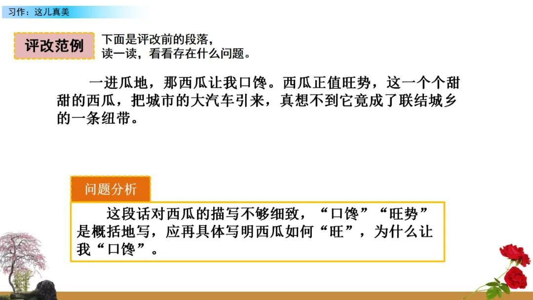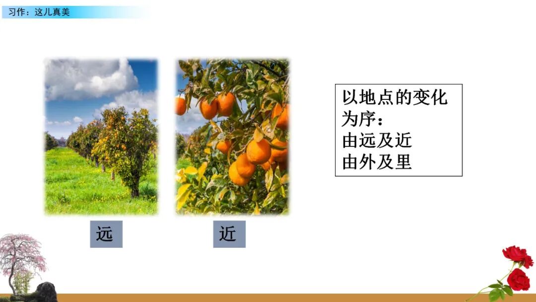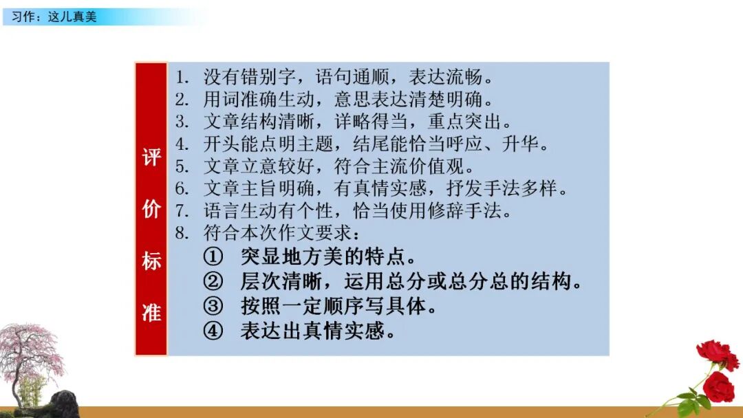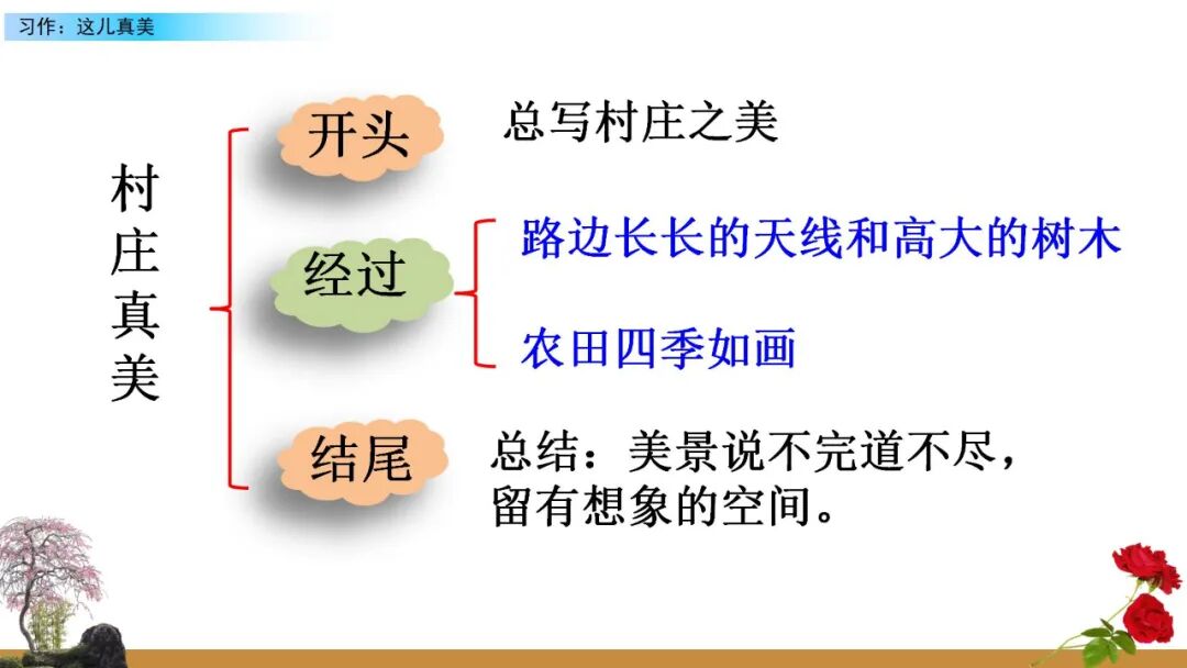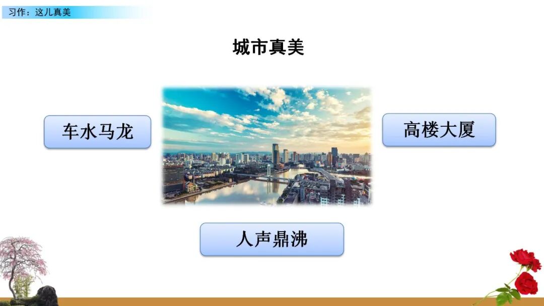 一、写作要求: 1.能仔细观察一处景物,并运用围绕一个意思写的方法进行写作,能主动运用平时积累的描写景物的词语。 2.能自己改正错别字,并乐于和同伴分享观察到的美景。 二、审题。 本次习作的重点是写一处身边的美景,要围绕一个意思去写。“这儿真美”要求我们仔细观察周围的美景,把看到的、听到的或者接触到的各种自然景物具体、生动地描绘出来,借此表达我们的感情。 三、选材和构思。 要想把身边的美景介绍给别人,就要仔细观察。先选定一处景物,再按一定的顺序观察,看看这个地方有什么,是什么样子的。观察时要注意抓住美景的特点。写的时候,围绕一个意思去写。写好后,修改并与同学交流分享。 四、围绕一个意思写 1. 确定要表达的主要意思。描写一处景物,先确定要表达的主要意思,想一想我们要表现这处景物的什么特征。如:富丽堂皇、雄伟壮观、五彩缤纷等。 2. 围绕一个意思写。确定了主要意思以后,就要围绕着这个意思来写。比如:要写“美丽的校园”,就要围绕校园的美丽来写,可以写美丽的花坛、假山等。我们可以运用从课文中学到的方法,先用一句话概括要表达的意思,再具体描写。 五、技法指导 1.细致观察,抓住特点。 2.理清思路,有序表达。 3.展开想象,运用修辞。 描景顺口溜: 注意顺序,做到言之有序。 抓住特点,做到说写具体。 仔细观察,做到言之有物。 展开想象,运用比喻夸张。 眼中有景,色形声态神变。 心中有情,喜欢热爱赞美。 写作方法小结: 一、开头(总写):回忆自己曾经到过的地方,觉得还是××地方最美丽。(略写) 二、中间(分写): (1)介绍你认为最美丽的地方的地理位置和它的一些总体情况。(略写) (2)重点写这里的美表现在哪些地方。可用对比写法写你为什么认为这里最漂亮。 可以按照四季的变化情况来描写。 也可以按照具有代表性的景物特征来描写。(详写) 三、结尾(总写):总结自己对优美景色的内心感受。 这里留下了我美好的回忆,希望有机会能再次到那里做客。(略写) 作文歌 写景物, 抓特点, 不要样样都写全; 观察顺序不能乱, 步步条理才清晰; 五官感受很重要, 看听闻尝加想象; 敢于表达敢于写, 写出作文一定好。 作文五步法