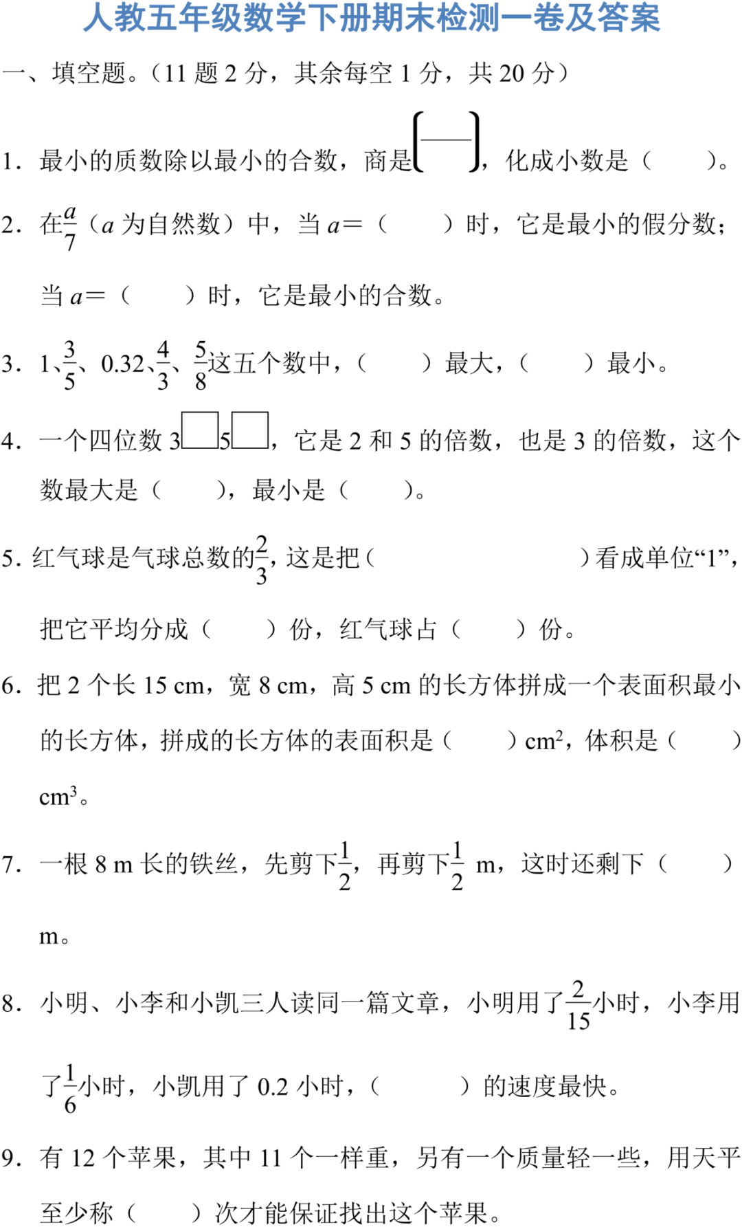 期末考试临近,为帮助孩子更好地复习,考出好成绩,帮助老师们节省时间,帮助家长有效辅导,教育好声音今天给大家送来了人教版五年级数学下册期末精选试题、附答案。一共11套。敬请老师们、家长们领取,帮助孩子,期末考出好成绩!